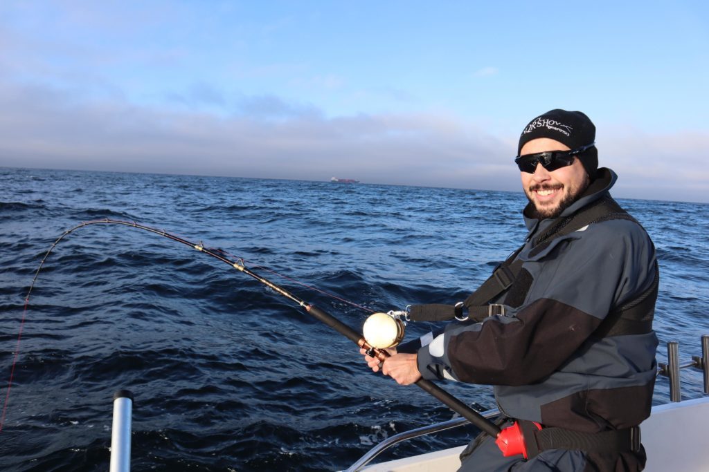 De to hadde sittet på havet noen timer uten føling på fisk. Fredrik forteller at han holdt på å spise en lunken pølse da det hylte i knarren på den grove havfiskesnella. Det var ikke til å misforstå: dette er fisk. De to fiskerne ser på hverandre og vet at nå skal de begynne å jobbe!