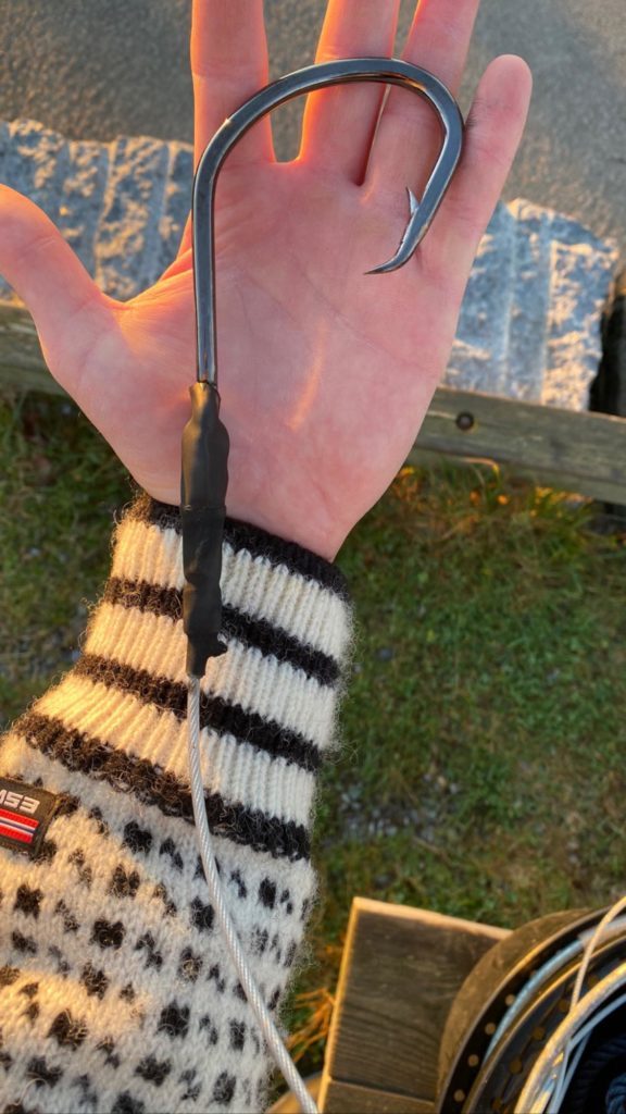 De to ivrige sportsfiskerne fra Østlandet rigget med Owner Super Mutu-kroker. Atle i str. 14/0 og Fredrik i 16/0 og med wire nederst. Litt ulike takler. Den som håkjerringa bet på var et ganske enkel glidende takkel på ca 10 meter totalt, hvor slepet er de siste 4 meterne.