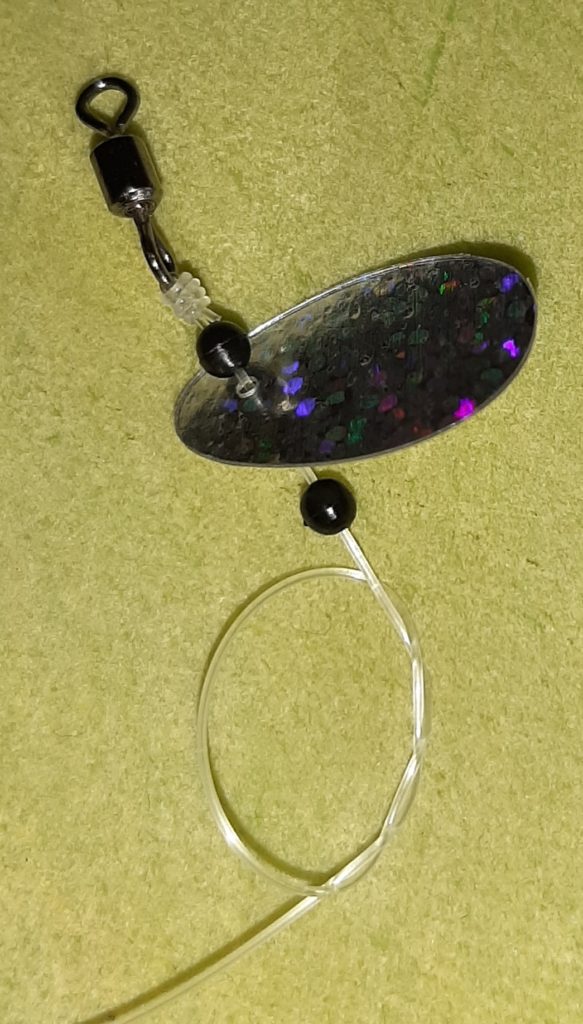 Etter at knuten er slått, flytter du deg 20-30cm oppover senestumpen, og slå en ny knute. Flytt ei perle inntil knuten, etterfulgt av et spinnerblad og ei ny perle, og slå en knute. Denne prosessen gjentar du like mange ganger som du har spinnerblader. Rekkefølgen oppover markdraget skal være slik; knute – perle – spinnerblad – perle – knute. Øverst på tackelet knyter du på en svivel, så du har en svivel i hver ende av tackelet.