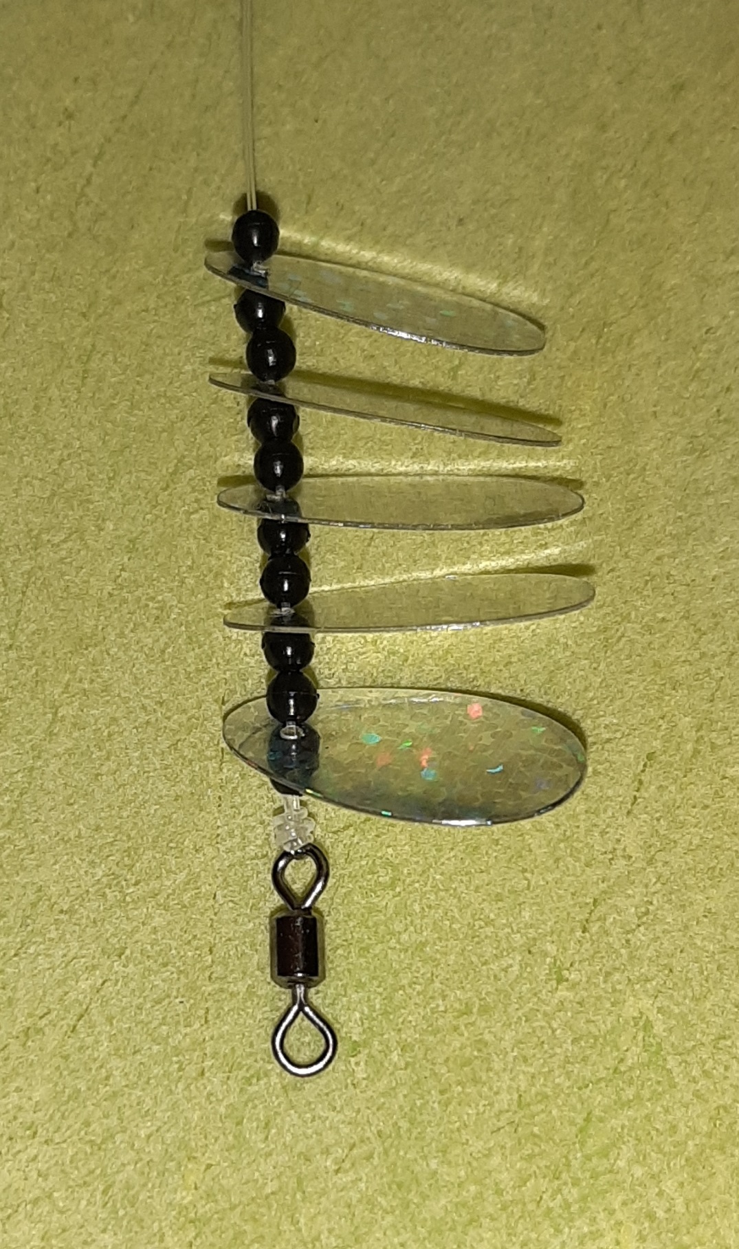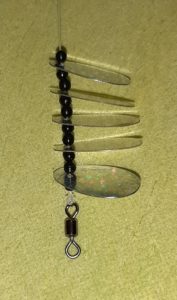 Kastbart markdrag 4) Tre innpå resten av perlene og spinnerbladene. Pass på at du har to perler mellom spinnerbladene.