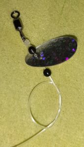 Kastbart markdrag 2) Knyt på den ene svivelen, tre på ei perle, så et spinnerblad og så ei perle. Slå en dobbel kjerringknute.