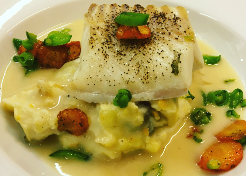 Fersk benfri torsk, servert over en kremet potetmos, fiskesaus, gulerøtter stekt sprø med litt sukker, salt og pepper samt rå sukkererter.