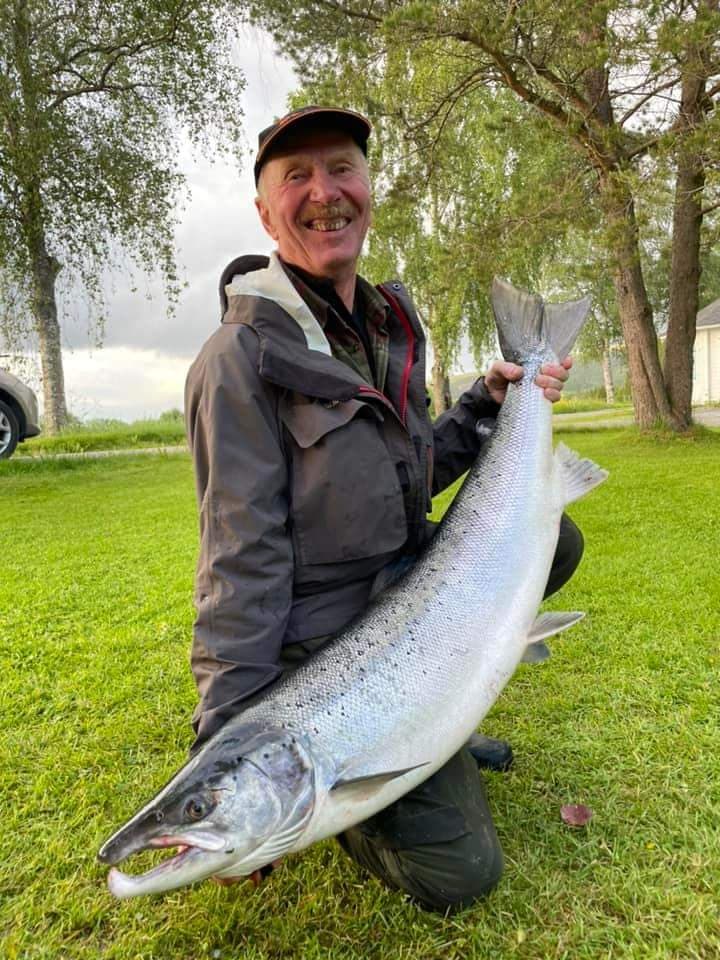 noe Kyrre Jonassen og fiskekompisen gjorde denne helgen. Det resulterte i en kjempestor sjøørret på hele 8200 gram.