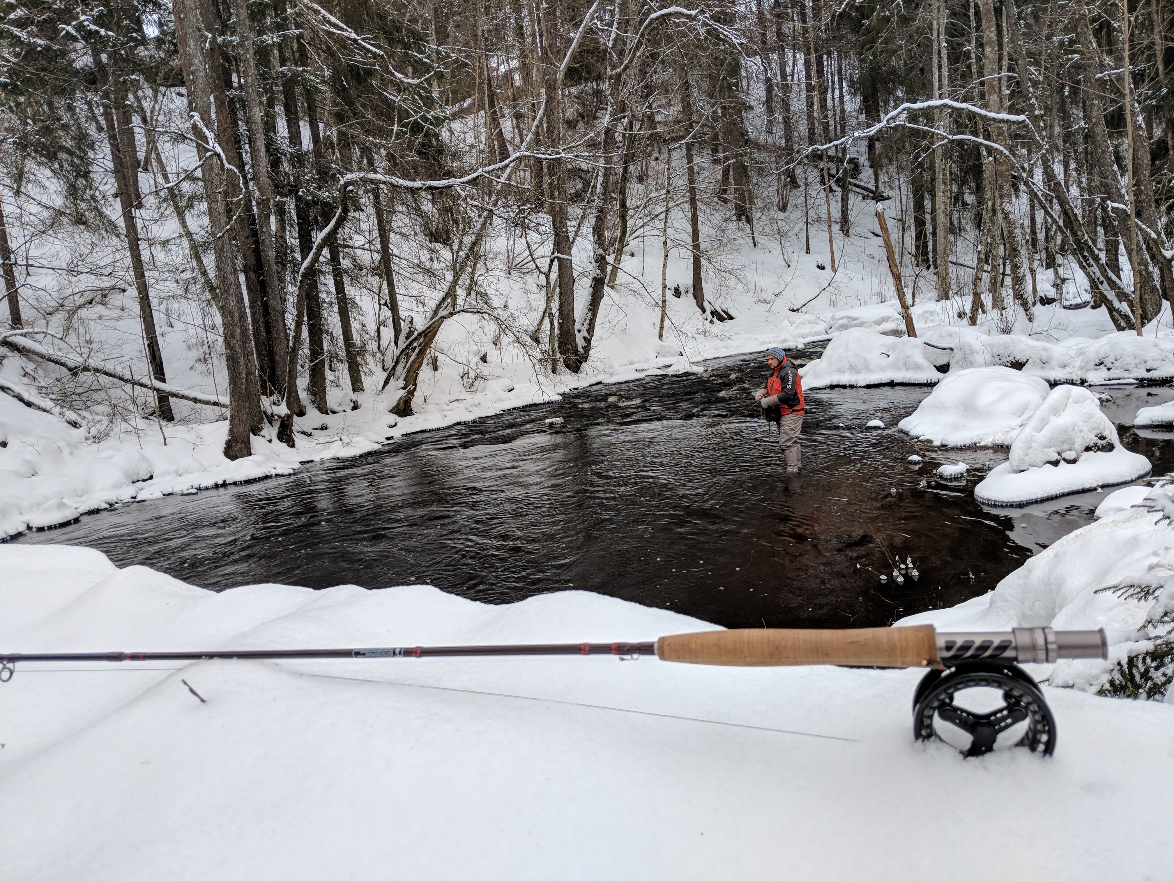 Vi kavet oss igjennom snøen ned til den første kulpen. Det var mer vann enn sist jeg var der og det så lovende ut. Men etter at vi begge hadde fisket over hele kulpen uten et napp fortsatte vi videre nedover. Vi spiste Wienerbrød og drakk kaffe og fisket i de kulpene vi synes så lovende ut. Jeg mistet noen nymfer. Ikke fordi jeg satt dem i bunnen, men på grunn av den helvetes krattskogen som hang over elven over alt. Det var ikke lett å få vippet ut en nymfe uten å få en kvist fra et tre på andre siden i veien. Og med 6x tippet så skal det ikke tykke greina til før det er snøret som ryker.