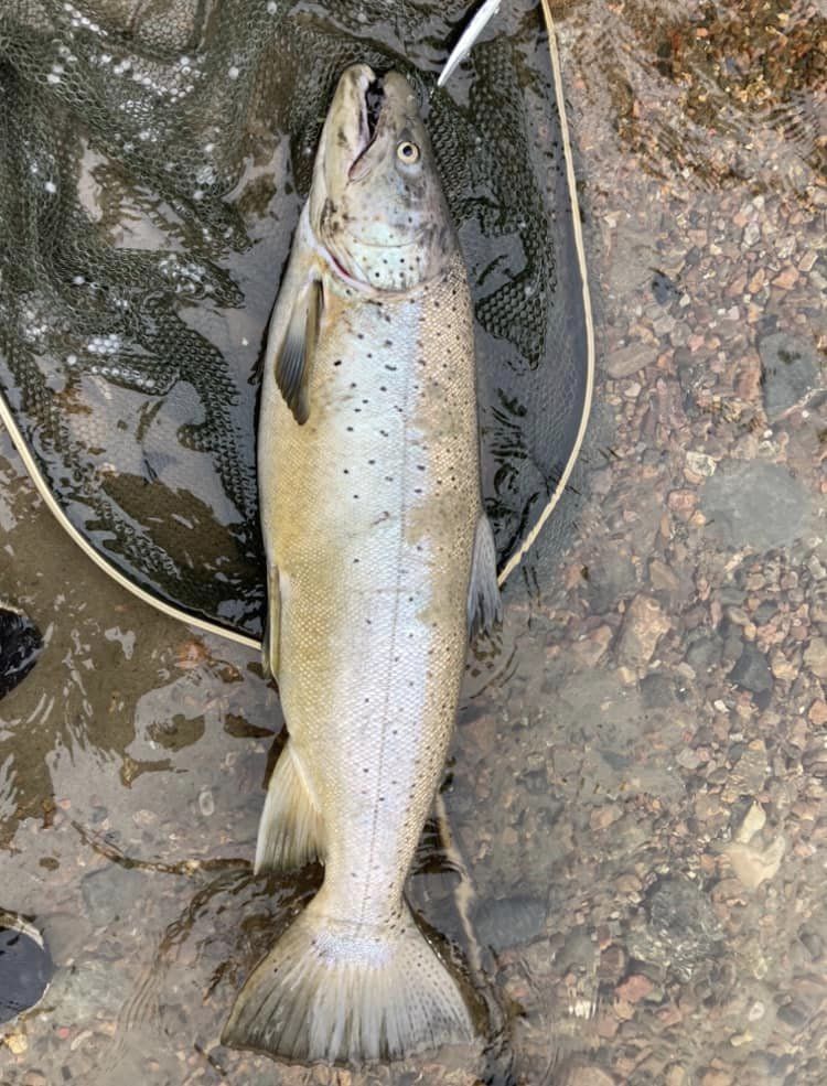 Med fisken i håven tar jeg sikte på nærmeste sted å gå i land. Som ivrig C&R-fisker er det utrolig viktig for meg å sette fisken tilbake uskadet, og dessverre er det et stort skår i gleden å se at fisken blør fra gjellene. Ikke fra en krok, for den er ikke kroket dypt, men antagelig etter det enorme basketaket i elva.