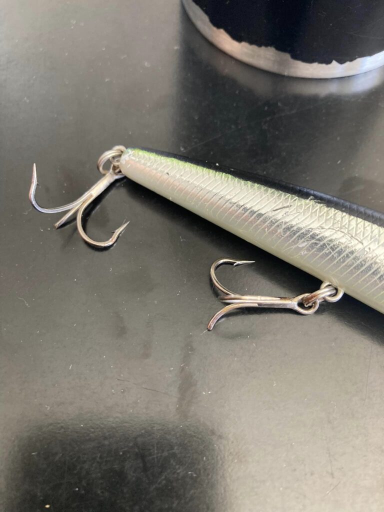 Daiwa-stanga i kategorien 10-40 gram står i 180-grader, og Shimano-snella jobber som besatt. Ingen tegn til skavanker foreløpig. Men hva med 0,40 fluorcarbonen og den stakkars wobbleren, en Duo Tide Minnow jeg fant i strandsona ved Hurdalssjøen i vår? Hvor lenge har den ligget der, og hvordan er kroker og splittringer etter lang tid i vannet…?