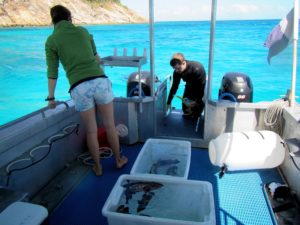 Forskerne oppbevarte fiskene i tanker om bord i båten før de slapp dem ut – mens dykkere kunne dokumentere hvordan det gikk ved hjelp av undervannskamera. Her er Vanessa Messmer og Graham Raby i båten. Bruk av undervannskamera er ganske nytt innen forskning på fiskens helse i forbindelse med fang-og-slipp. (Foto: Josefin Sundin)