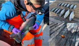 Forsker Anne Hege Straume leter etter lus på en pukkellaks fanget i Havforskningsinstituttets ruse.Fotograf: Alle foto: Rune Nilsen / Havforskningsinstituttet