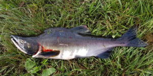 Kjønnsmoden hannfisk har en pukkelliknende forhøyning på fremre del av ryggen, derav navnet pukkellaks. Foto: Henrik H. Berntsen.