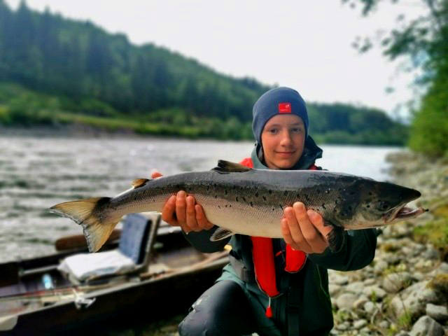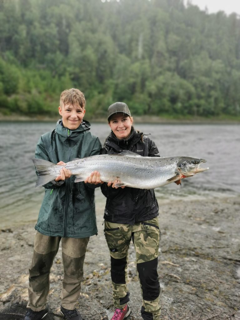 Jeg reiste til tunet sammen med min sønn Johannes, på 13 år. Litt av målet med turen, var å få han mer hekta på fiske, sånn at vi kan ha denne felles interessen med oss videre i livet. Han var glad på mine vegne for storfangsten, men det er ikke vanskelig å forstå at han var litt misunnelig, og gjerne skulle dratt opp noe selv. Han overtok resten av tiden med roer. Kvoten min var likevel tatt denne dagen. Og så, endelig på dag 2 fikk Johannes opp en blank og fin nygått laks på 2.2 kg. Hurra!