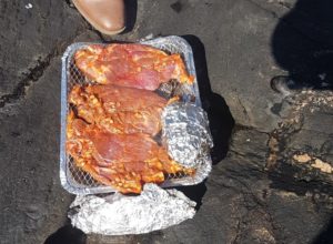 I litt lee for vinden satt kompisene mine seg i sola, mens jeg rigget meg klar for noen kast. Litt problematisk å få kastet i motvind, men gikk bedre når jeg tok meg tid til å ta på vaderne. Etter å ha fisket langs bergene uten så mye som et napp, rigget jeg i gang engangsgrillen og ordnet mat til disse karene jeg hadde tatt med meg på tur. Nå skal det sies at jeg er veldig glad i å lage mat, ellers hadde jeg vel håpet at noen andre kunne ordnet det mens jeg fisket.