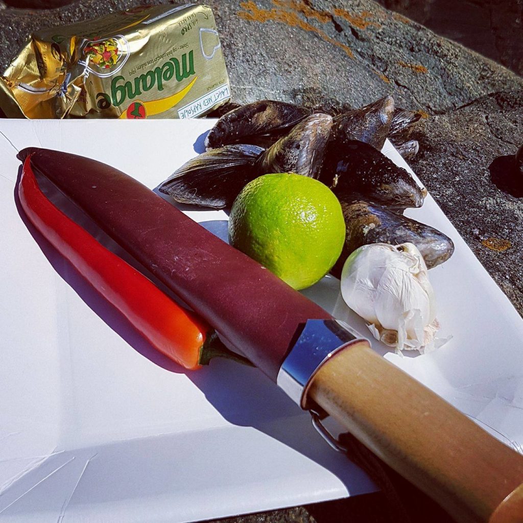 Før jeg dro hjemme ifra hadde jeg sjekket Blåskjellvarslet (http://www.matportalen.no/verktoy/blaskjellvarsel/) for å se om man kunne spise blåskjellene i fjorden. Ettersom varslet viste at man kunne spise de i fjorden, så pakket jeg med meg lime, chilli, hvitløk og smør som kunne være godt til disse. Siden jeg plukket de inne på grunna, så gadd jeg ikke å lage altfor mange for du vet jo aldri om de er helt bra. Da jeg heller ikke liker konsistensen, ble det mer til Joakim og Acke.