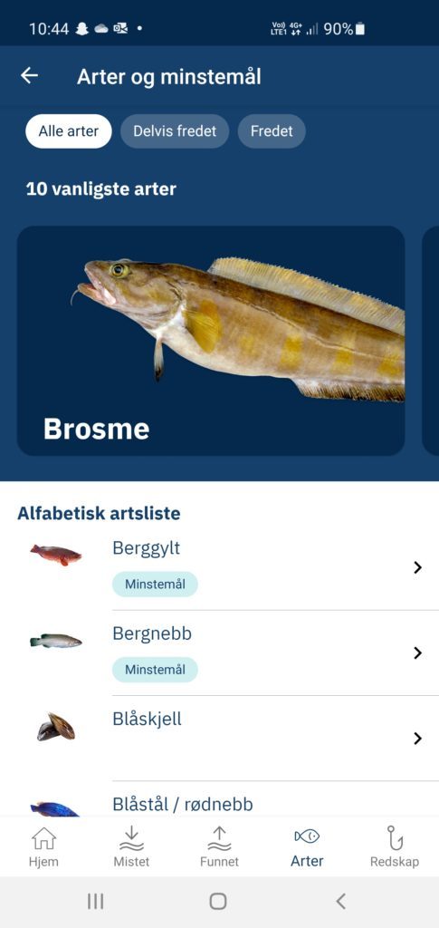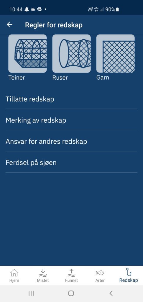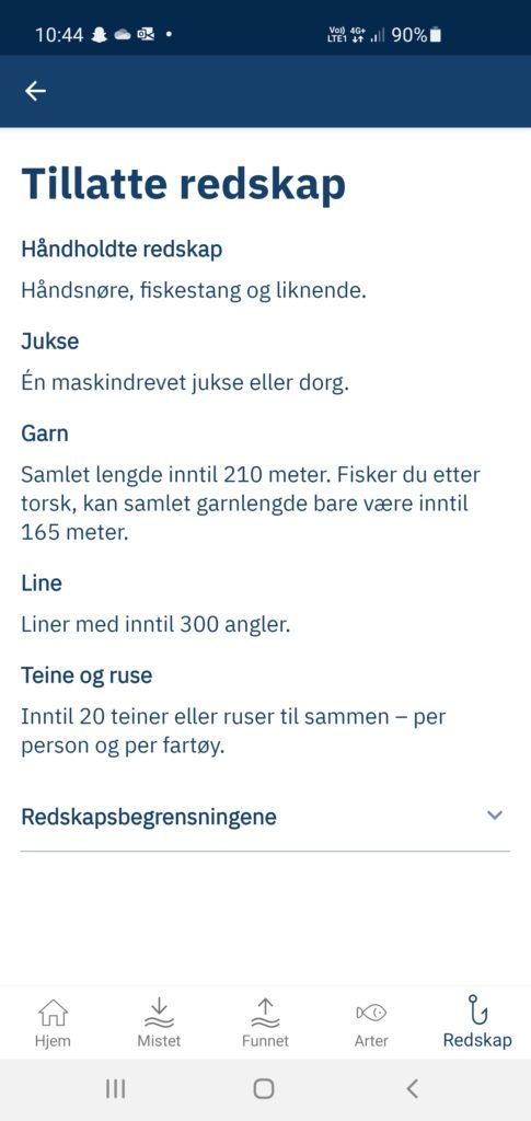 Applikasjonen gir deg også oversikt over fiskeregler for både arter og redskap som kan brukes.