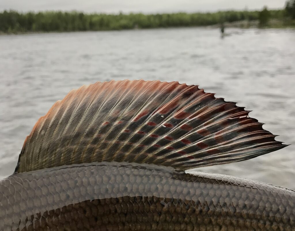 Forrige tur i Pasvik startet jeg med å binde på en artikulert streamer, en såkalt Circus Peanut i fargen oliven på om lag ti centimeter. På første kastet smalt det ordentlig i sjuerstanga, og hugget var så kraftig at jeg var overbevist om at en pen ørret hang på i andre enden. I den strie elva slåss den som en liten okse, og tok faktisk litt snøre. Da den kom inn så jeg et stort seil på ryggen dens. En flott harr på 1,6 kg. Selv om dette er en høvelig stor harr har den ikke en stor munn, men likevel banket den på den kraftige streameren. Ingen pysefisk hadde gjort det.