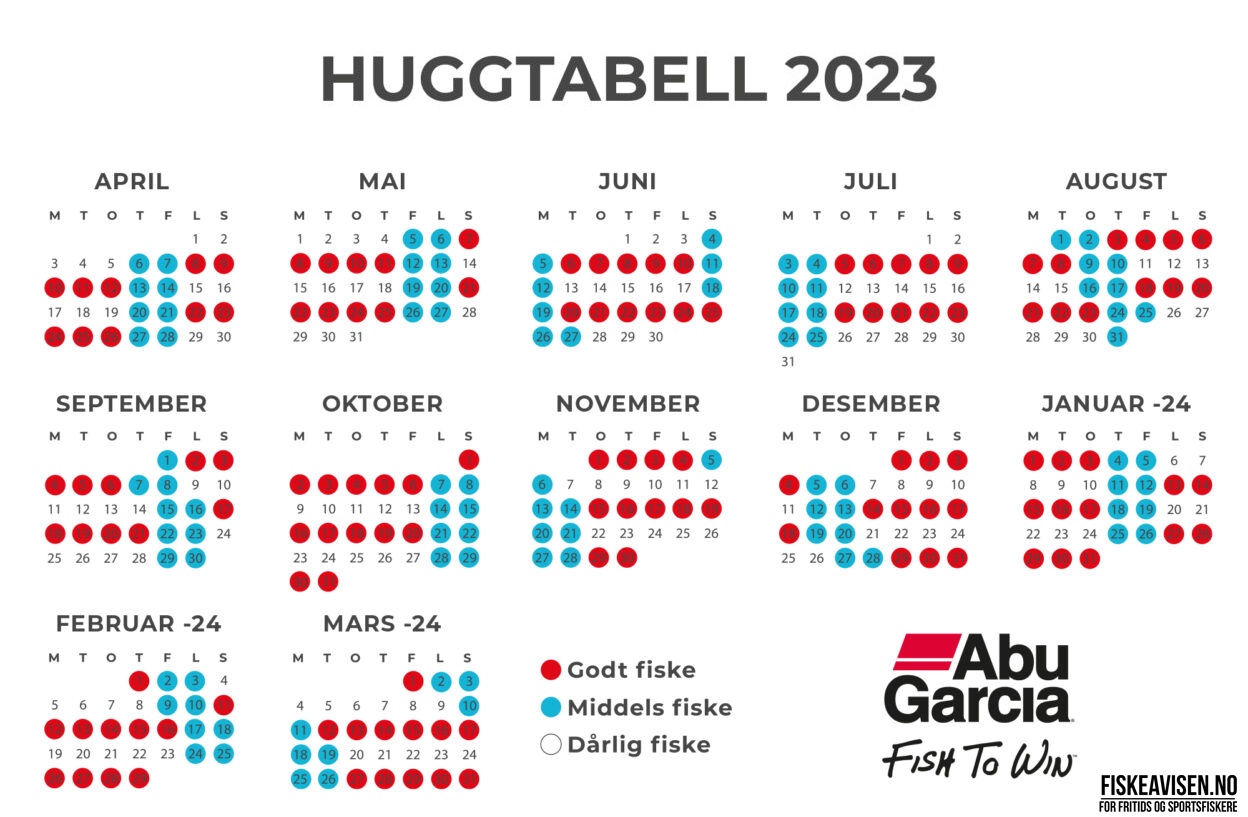 Nå er det bare å begynne å planlegge fisketurene med denne fiskekalenderen for 2023! Med huggtabellen ser du hvilke dager som har dårlig fiske, middels fiske og godt fiske. Det vil ikke si at det ikke er vits å dra ut om det er dårlig fiske. Selv da kan man få fisk og flotte natur opplevelser. Skitt Fiske!