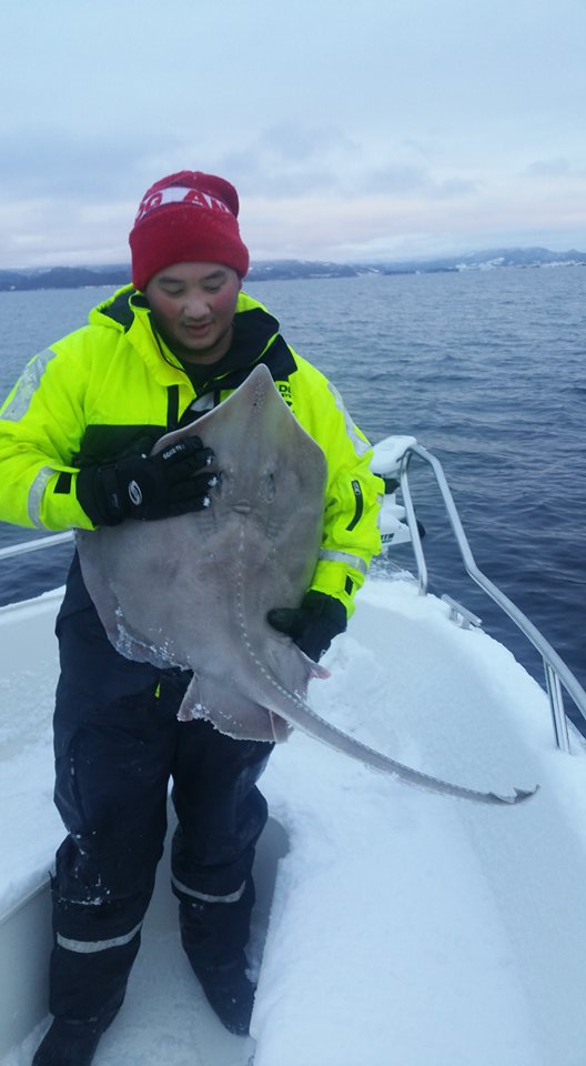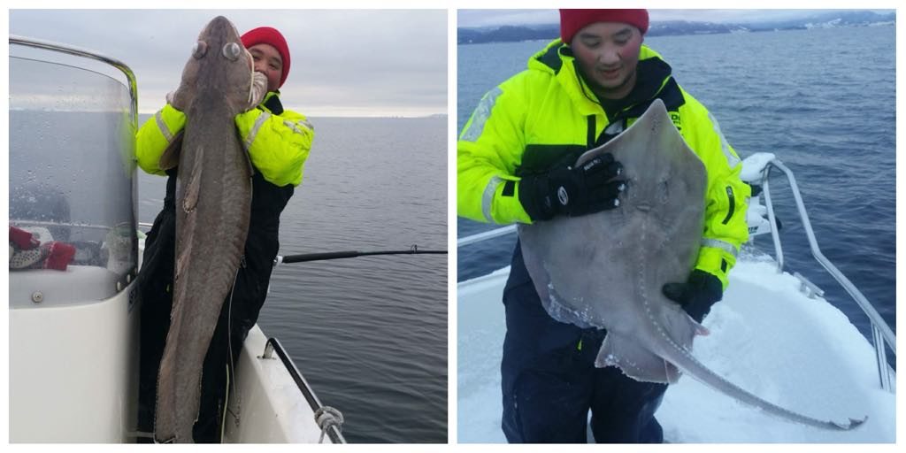 I bitende kulde la de ut på en 40 minutters båttur en desember dag. Snøen falt og kulden kjentes i både armer og bein. Men premien ble en hinsides god dag med fiske. Hvitskate og flott lange.