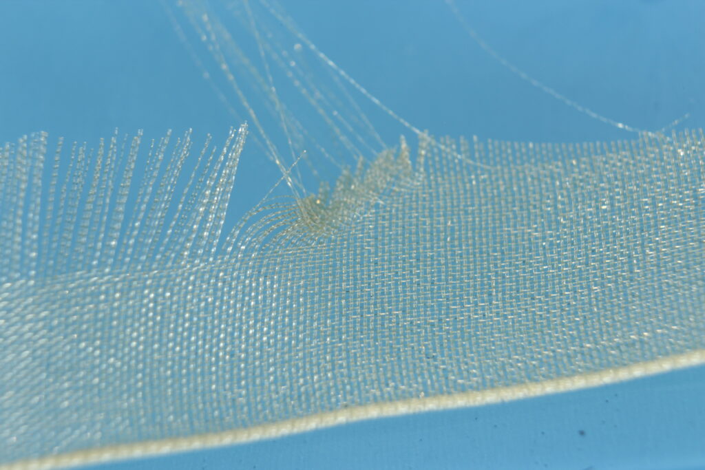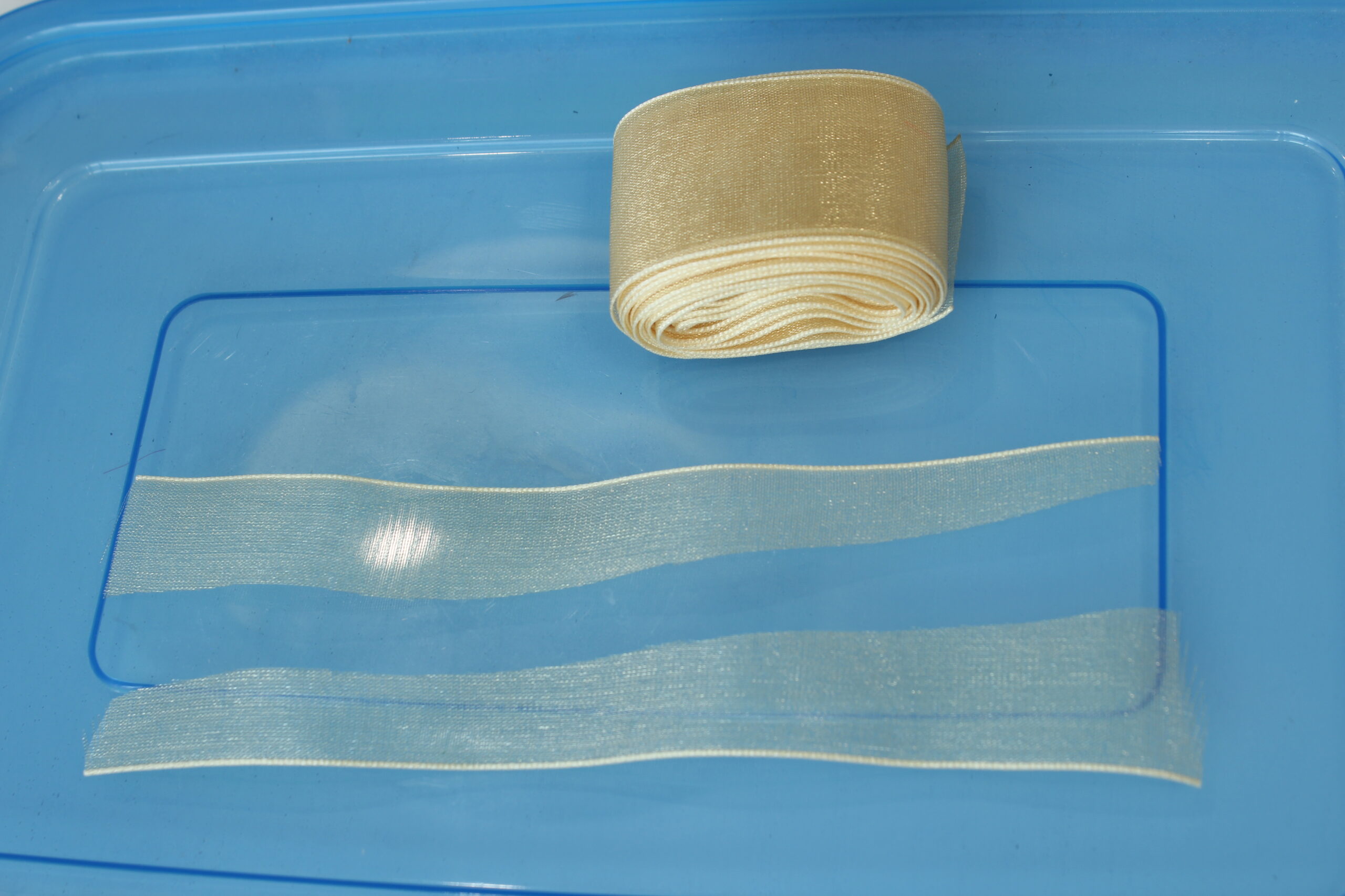 Dersom du ikke allerede har det i samlingen av bindematerialer kan du kjøpe Organza Ribbon på ebay for noen få dollar. Du kan få tak i det i flere farger og bredder. Jeg bruker en med bredde på 1 tomme. Fargen jeg har på denne flua er cream/khaki, men den fungerer også godt med rosa, oransje, hvit eller oliven.
