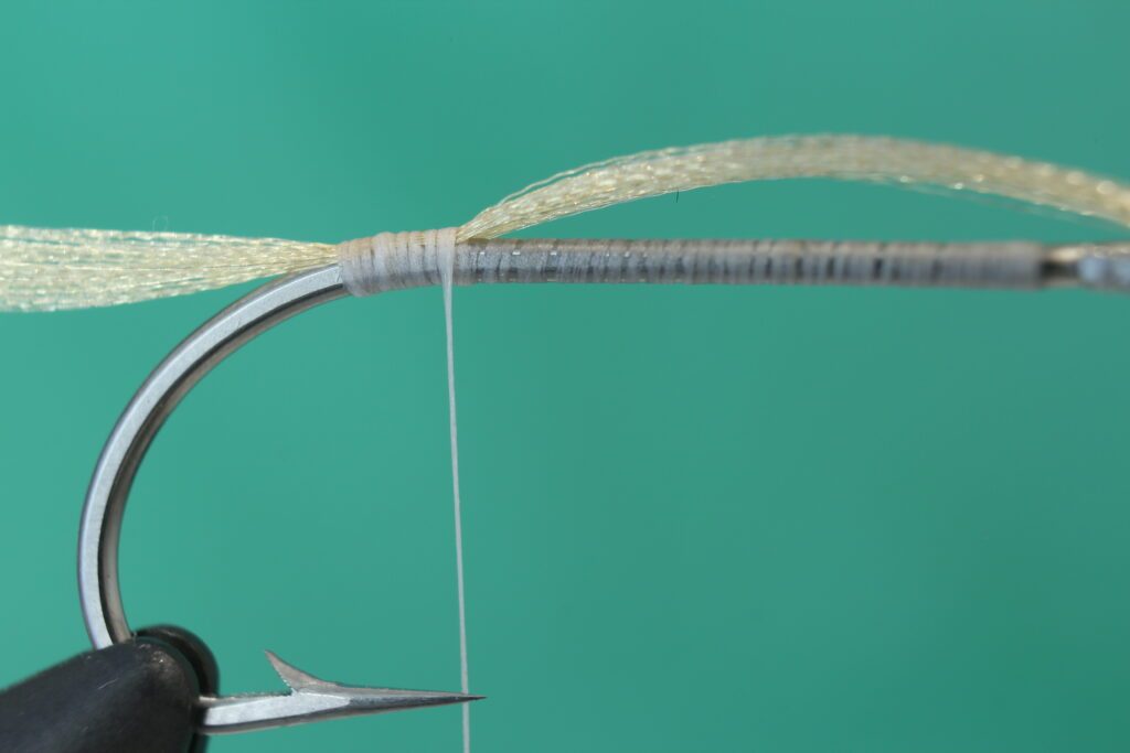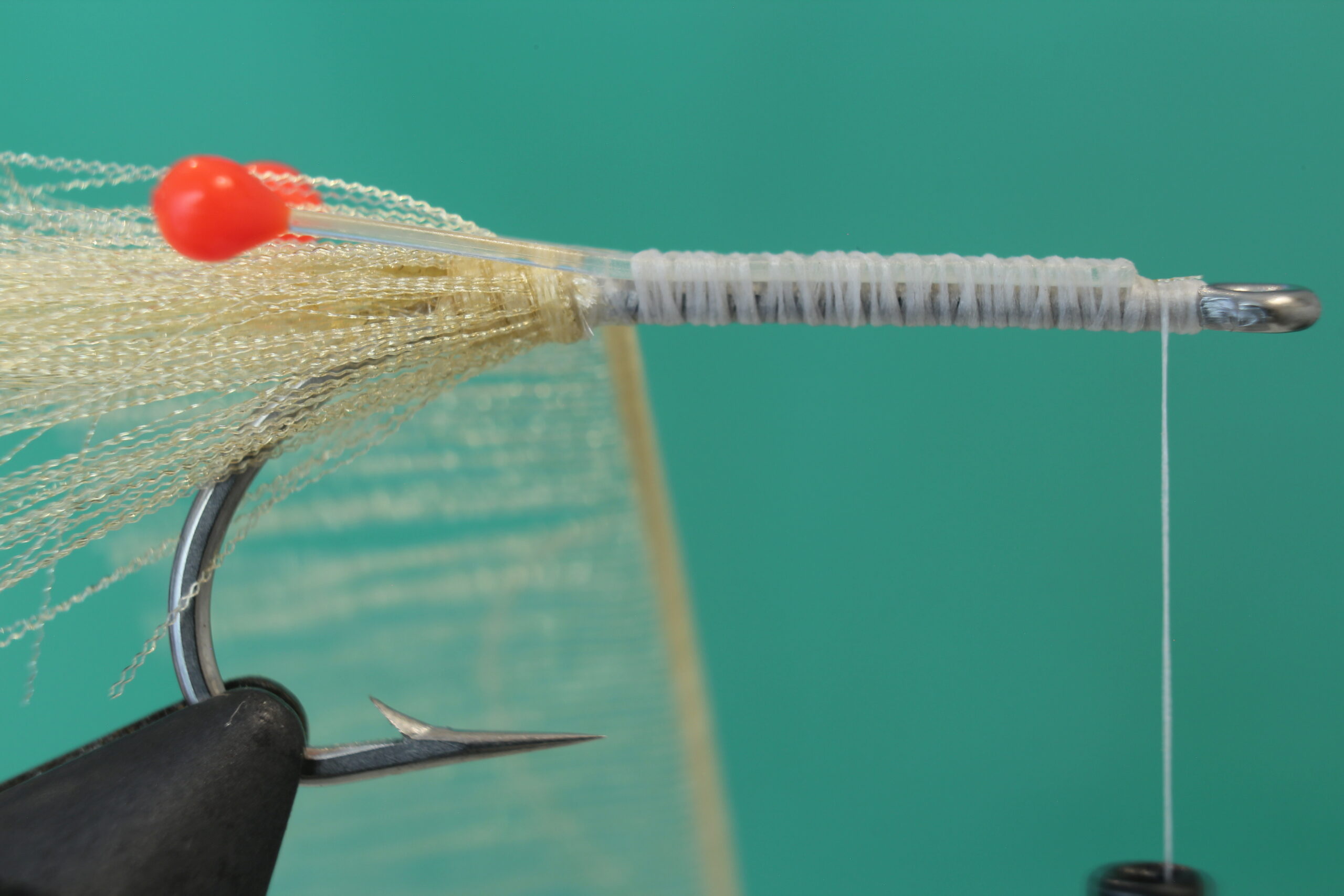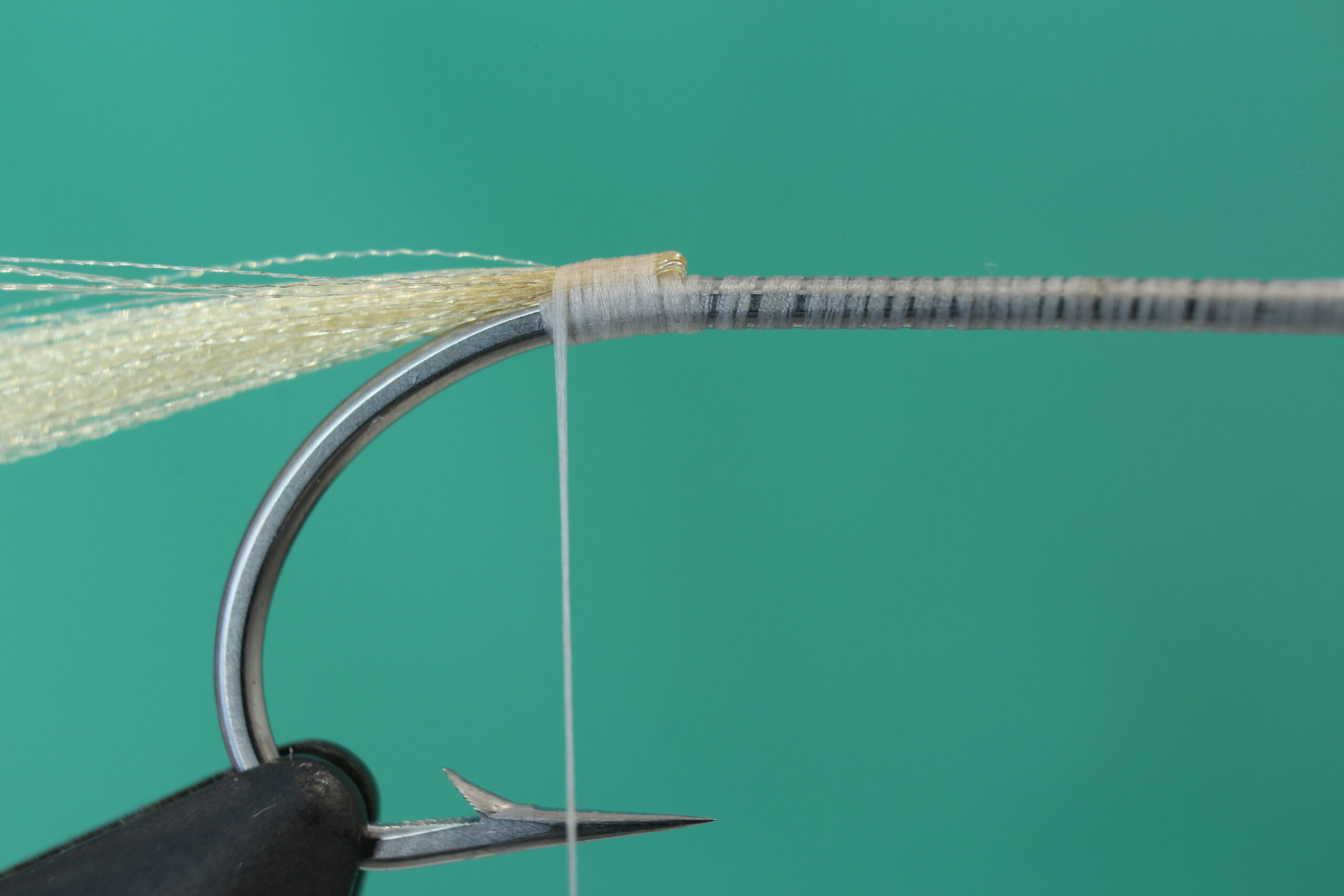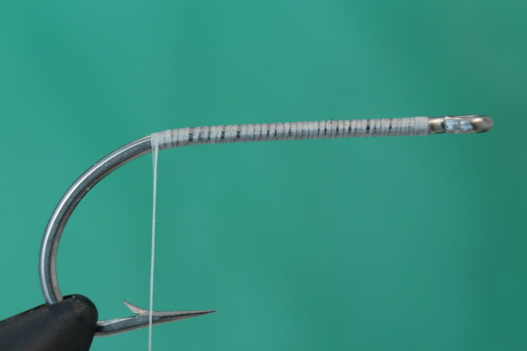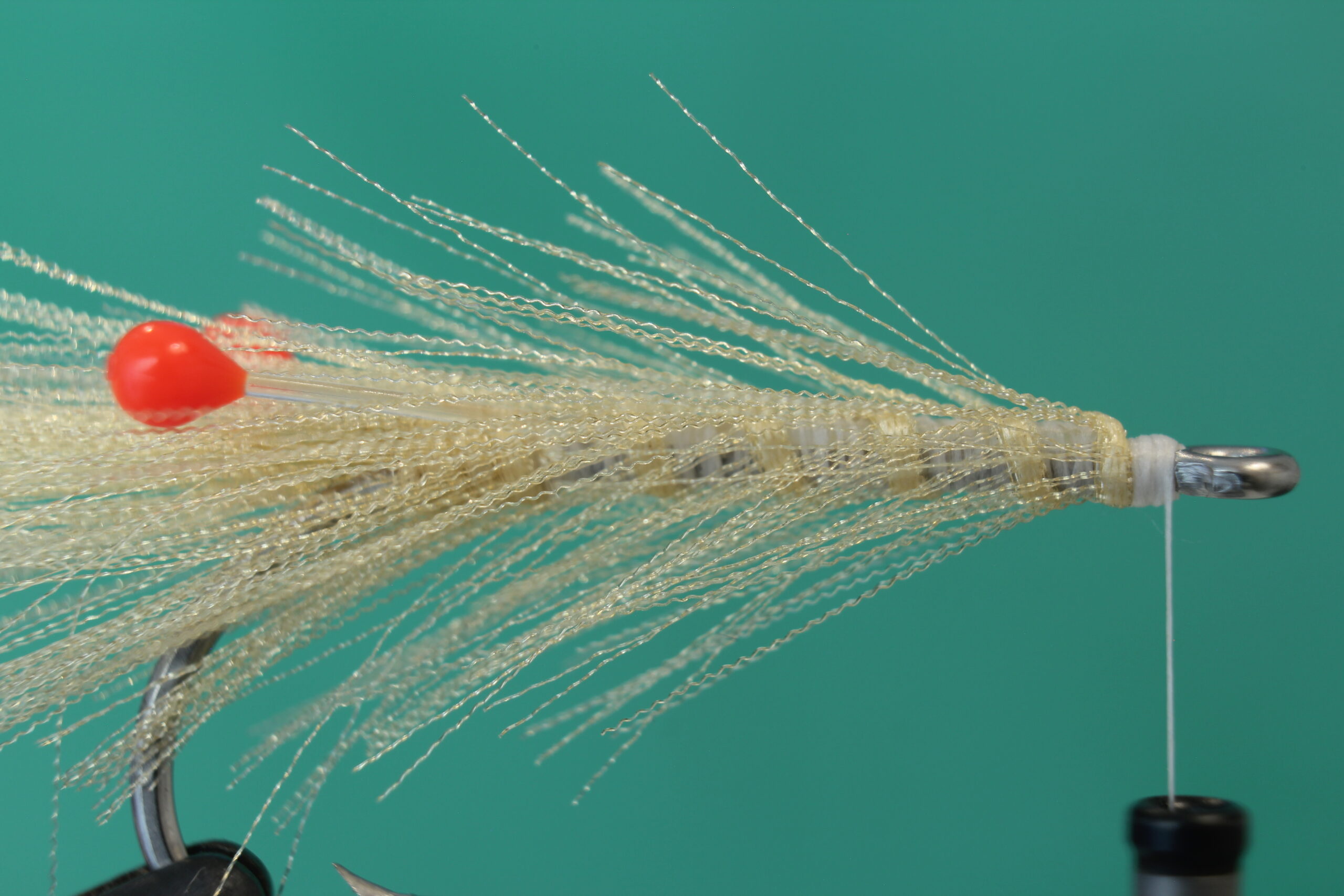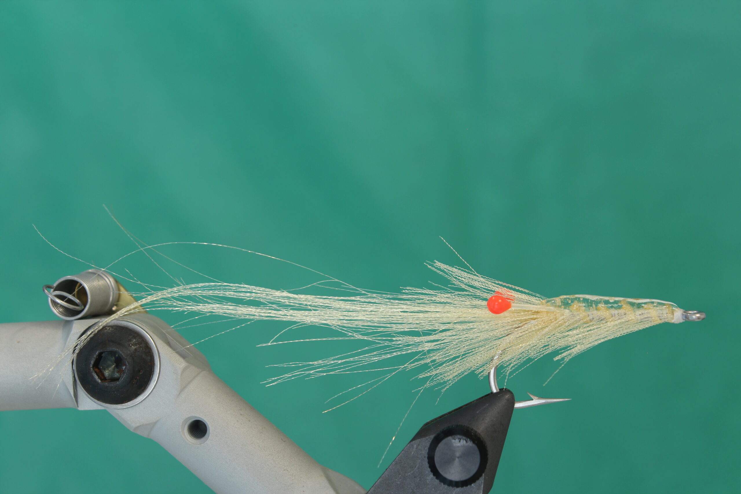 Sett kroken i bindestikka. Jeg bruker en Daiichi 2546 i størrelse 2. Du kan også bruke andre saltvannskroker og binde flua i andre størrelser. Jeg pleier å binde denne rekeimitasjonen i størrelser mellom 6 og 2. Bindetråden er Veevus 10/0 i hvit. (Flua kan få fine effekter dersom du bruker en bindetråd i andre farger eller lager en underkropp med for eksempel Pearl tinsel.) Bind inn tråden nær krokøyet og dekke kroken til du har tråden i krokbøyen.