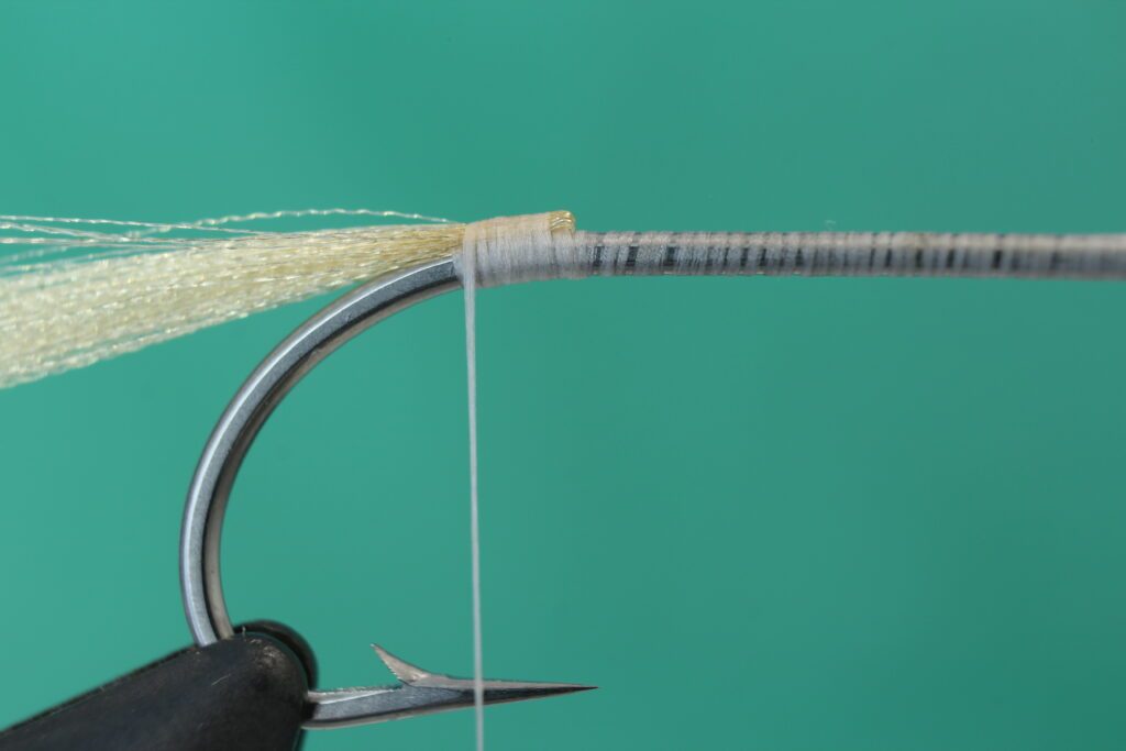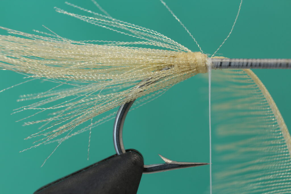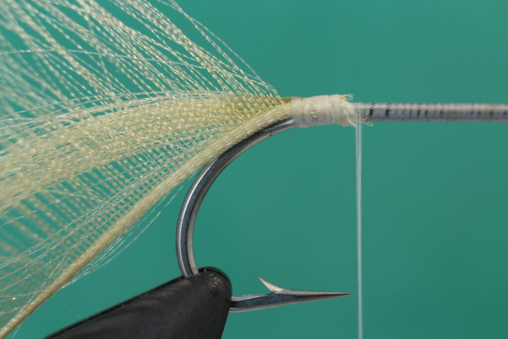 Bind inn de løse fibrene du trakk løs fra Organza hacklet. Jeg pleier å bruke krokspissen som referansepunkt for hvor jeg skal stoppe innbindingen.