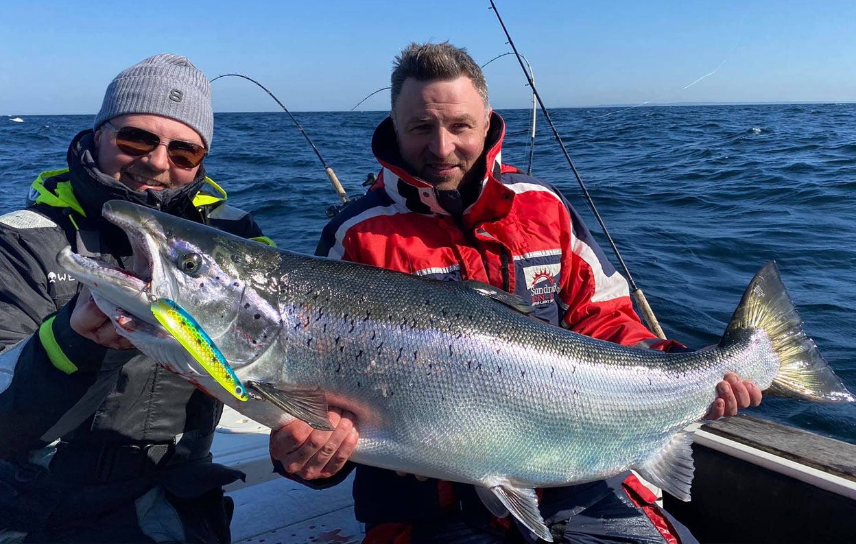 […] Først fik vi en lille laks, men omkring en time senere hugger den store laks hårdt, og den tunge laks tog flere udløb på mere end 200 meter. Kraftig vind på 10 m/s gjorde det vanskeligt at bremse båden, siger guide Johan Abelsson til Fiskeavisen. […]