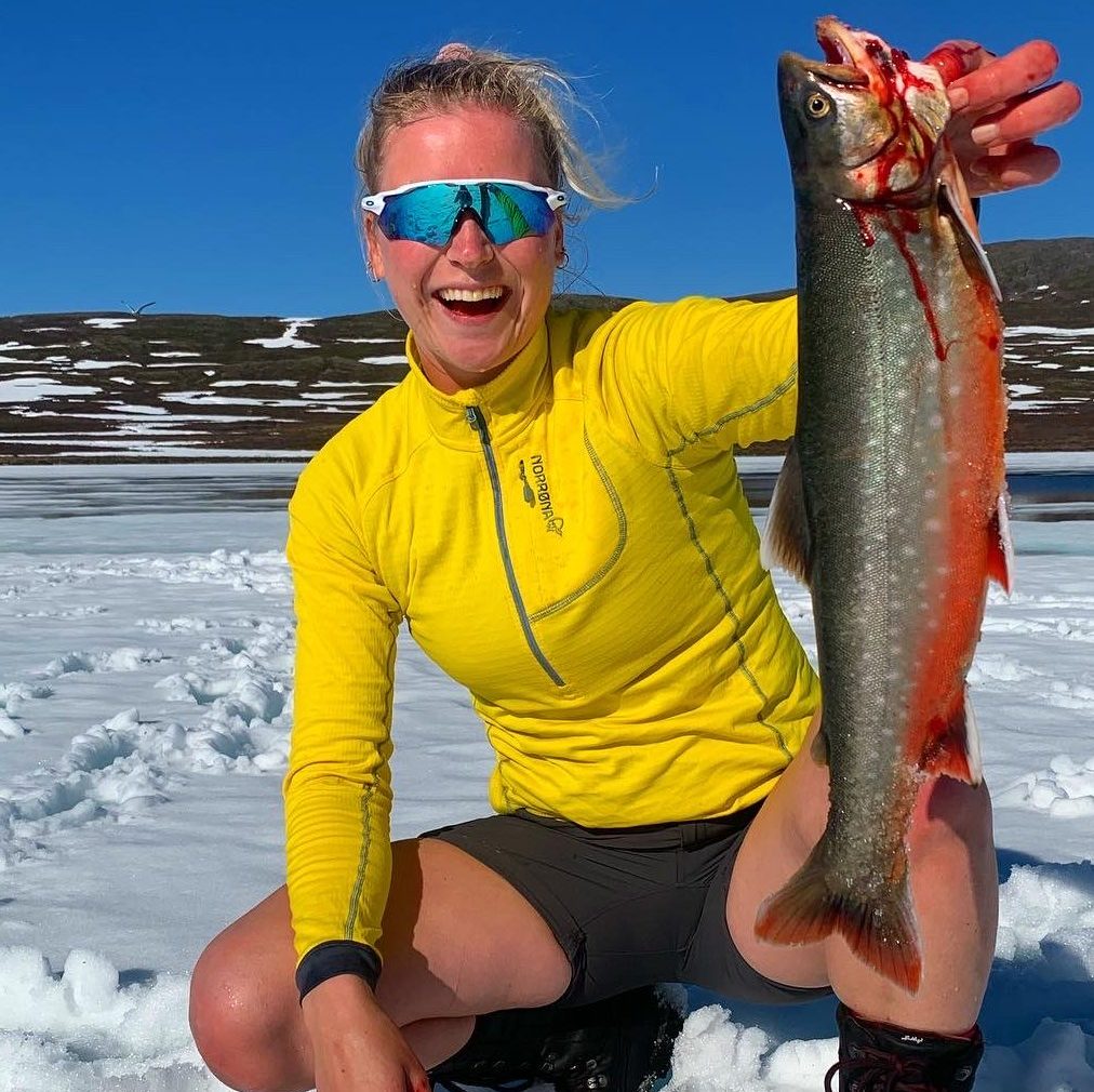 Christina slipper ned favorittskjeia og gjør et par hissige tilslag og det går ikke lang tid før fire feite røyer er i hullet. Den første som landes på isen er av god kvalitet og knallrø.