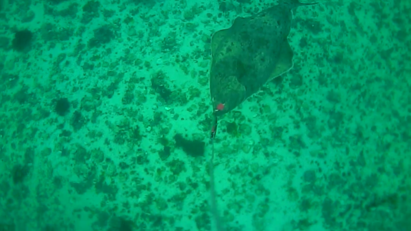 En liten stund senere oppdaget vi en ny fisk som så betydelig mer interessert ut. Den fulgte etter jiggen til Ingemar en god stund og da han sveivet opp til overflata fulgte den med helt opp, men uten å ta. Kveita var nå nede på bunnen igjen og jeg kasta ut Stormjiggen. Umiddelbart kunne vi se fisken vise interesse igjen og den begynte å sirkulere rundt jiggen.
