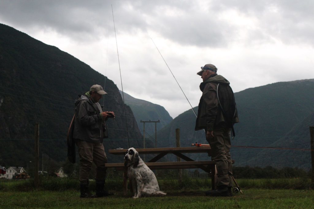 På andre siden av hølen har Anders plassert seg. Jeg står på steinen og forteller han hvor han skal kaste. Etter flere flyt over de store fiskene flytter han seg lenger opp i elva. Mens jeg står der og speider får jeg besøk av Vidar Paulsen, flere ganger norgesmester i fluekasting. Han blir stående sammen med meg og se på ørretene. Mens han speider trekker han frem tobakkspipa si, stapper den med tobakk og tenner den. Det er fascinerende å se hvordan en gammel fluefisker klarer å holde roen når det står et titalls store sjøørreter rett foran han ute i elva. Selv har jeg vært nær hjerteinfarkt flere ganger i løpet av denne dagen. En liten regnskur gir oss litt håp. Da er vi fiskere plutselig litt mer usynlige og kan prøve å lure en av dem til å ta flua vår. Vi står noen meter unna hverandre og kaster. I løpet av en time har vi prøvd det meste i boksen, både tørt og vått. Vi får melding av Anders om at middagen er klar og vi gir oss for dagen.
