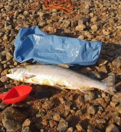 Båten ligger utenfor elveutløpet, rundt 40 – 50 meter fra land når det er høyvann. Laksen som hadde forvillet seg opp i båten skulle vise seg å være en hannlaks på 8.2 kilo.
