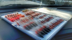 Jeg fisker kun med noen få forskjellige typer fluer gjennom året. Nå denne årstiden er boksen fylt med Klympen, Kobberbassen, Pattegrisen, noen få cdc reker, Speykutlingen, Redhead kutling, Vaskebjørn og Jiggy. Stort sett det samme som alltid.