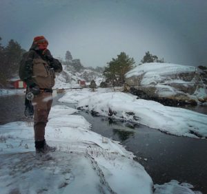Ja vinterfiske etter sjøørret langs kysten kan være tøft med tanke på kulda til tider. Jeg selv forflytter meg mye på denne årstiden og kler meg deretter. Ullundertøy, en bibs og en ullgenser. Så må jo vaderen på og en vindtett jakke. Lue er en selvfølge og et par vindtette hansker uten fingre når jeg fisker. Har også med noen varme og gode votter jeg tar på når jeg forflytter meg. Man forflytter seg mye og kan bli lett svett. Da er det fort gjort å begynne å fryse etter en liten stund. Bedre å kle seg lagvis og heller ha med en ekstra ullgenser eller lignende i sekken. Om hendene blir for kalde så slår jeg gjerne «kråke» med hendene. Det hjelper alltid.