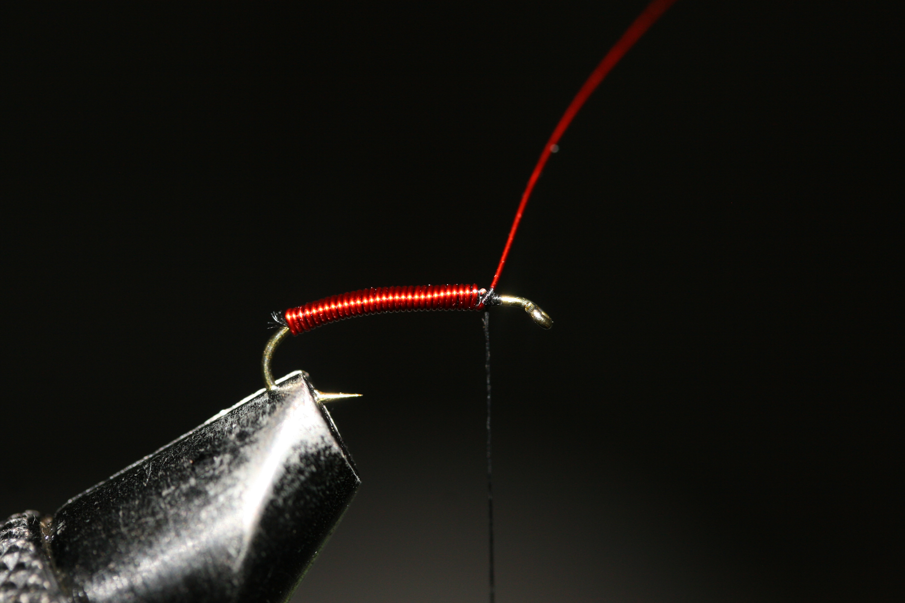Brassie 5) Fortsett å vikle koppertråden fremover og fest den med noen tighte tørn med bindetråden. Pass på at det er plass til fremkroppen.