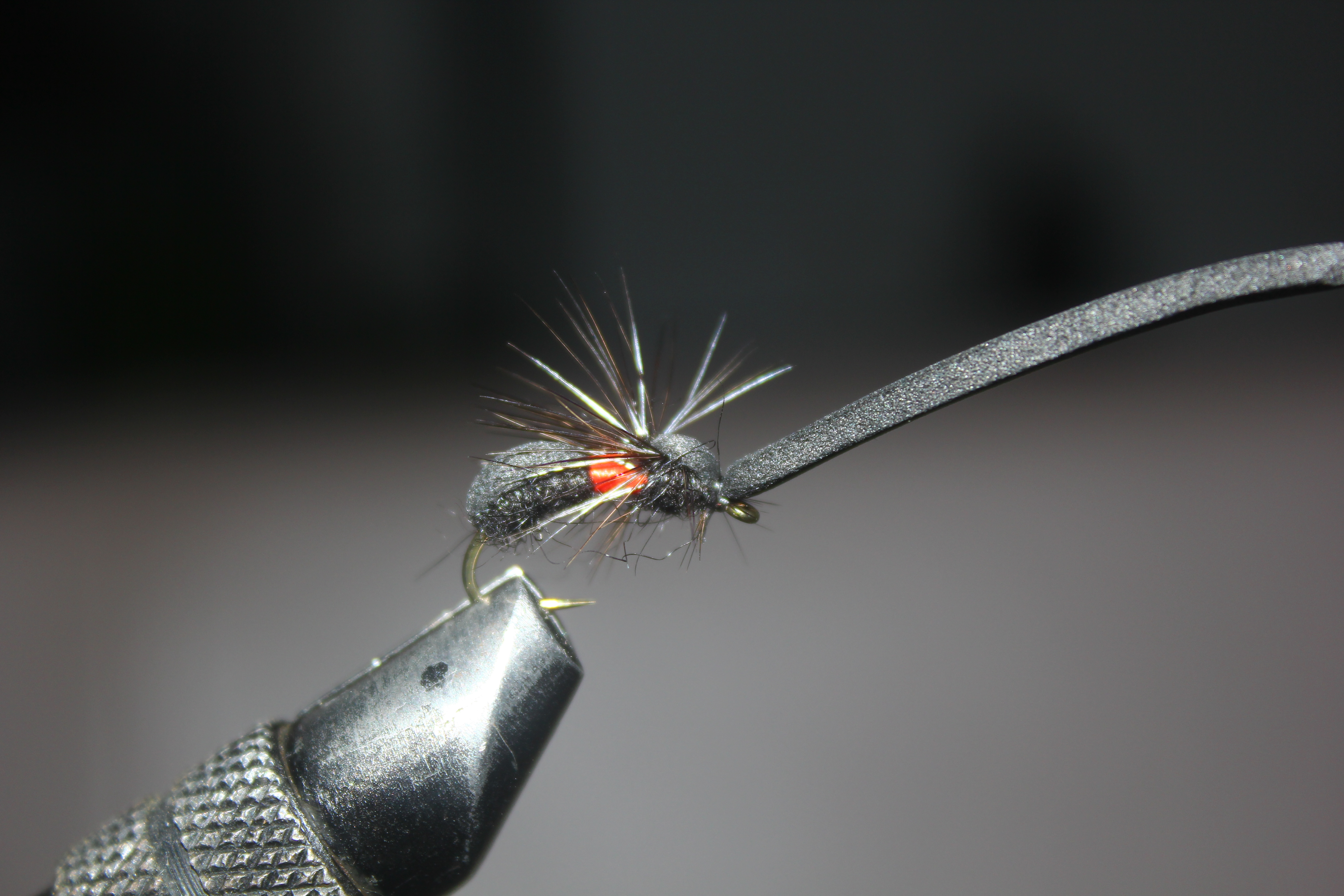 14) Ørretboksen - enkel maur: Løft foamstrimmelen opp mens det legges noen surringer mer bindetråd bak krokøyet. Whip finish og klipp av bindetråd og foamstrimmel. Foto: Lasse Bøe