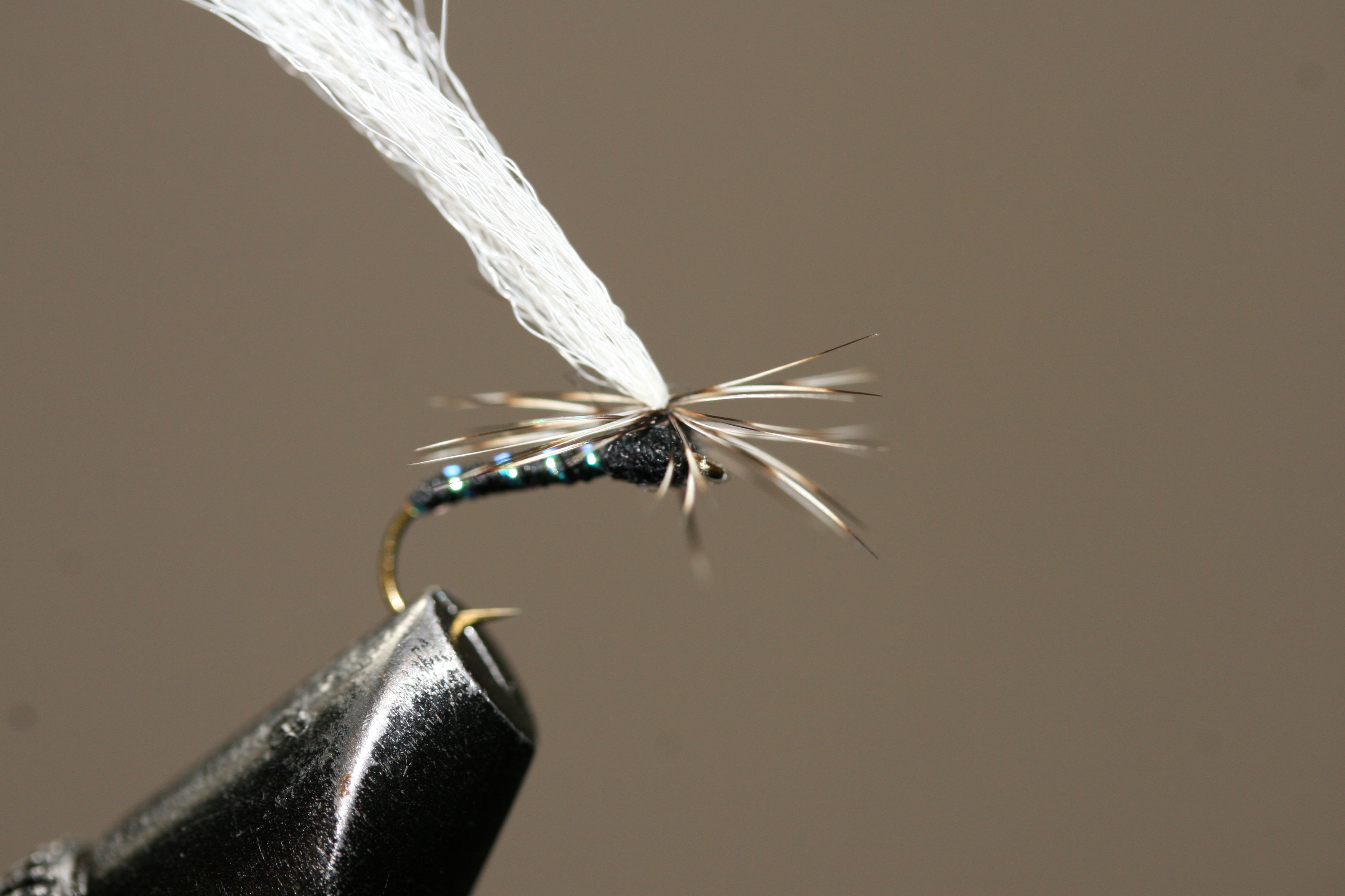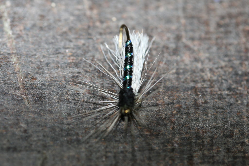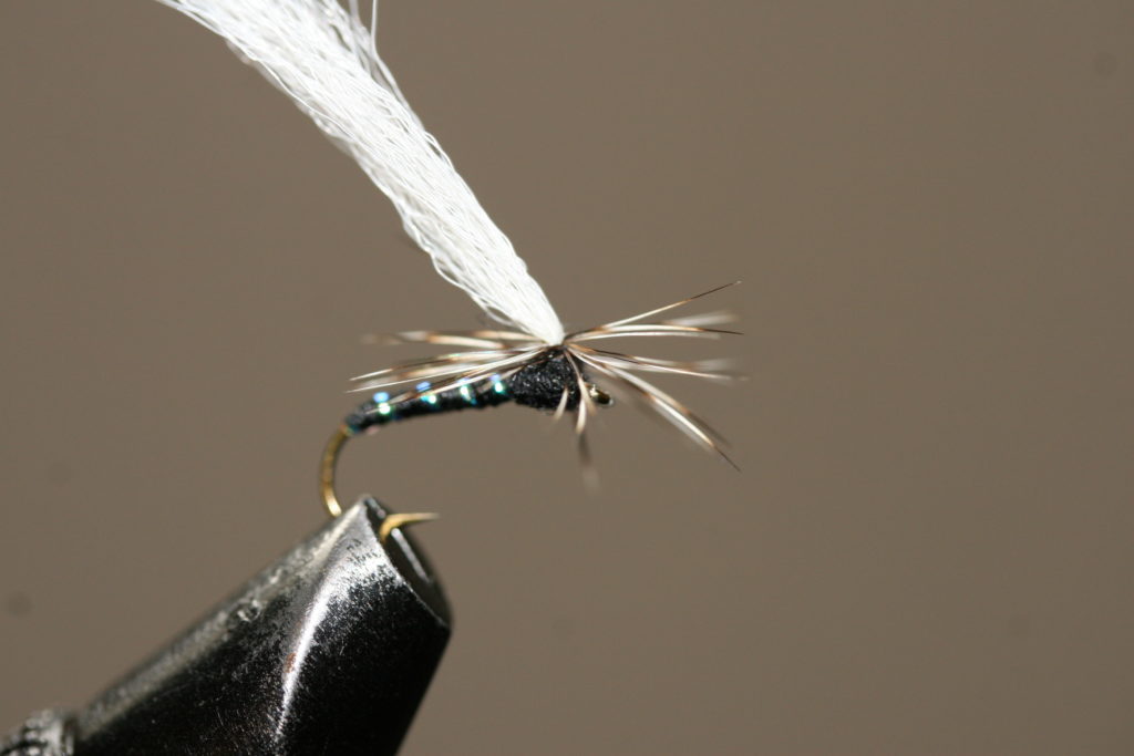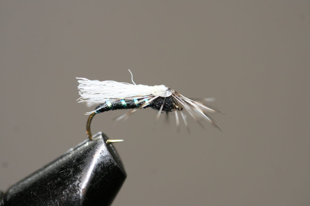 Bakkroppen er sort bindetråd, med et enkelt flashstrå som rib. Vingen er hvit polygarn bundet inn som en fallskjermvinge, mens forkroppen er svart dubbing. Et grizzly-hackle tilpasset krokstørrelsen bundet inn horisontalt rundt vingerota imiterer bein. En liten klatt smeltelim i vingebasen på fallskjermhackelet mens man drar vingen bakover sikrer at vingen holder seg i denne posisjonen.