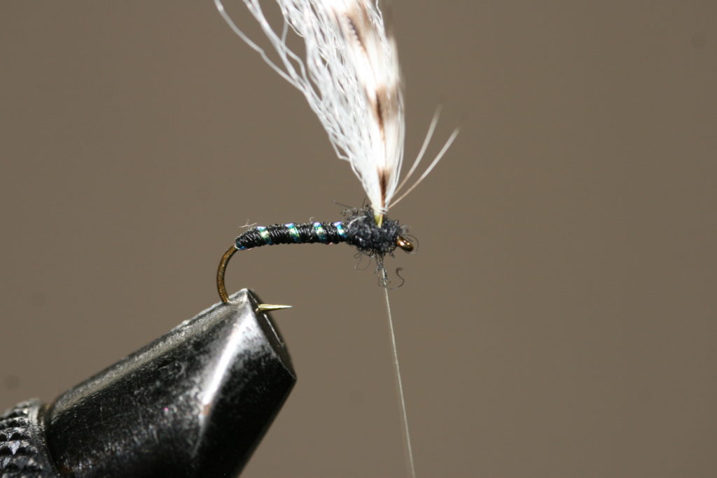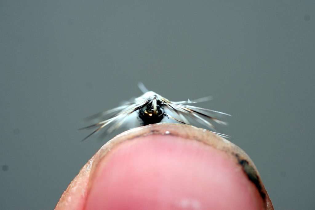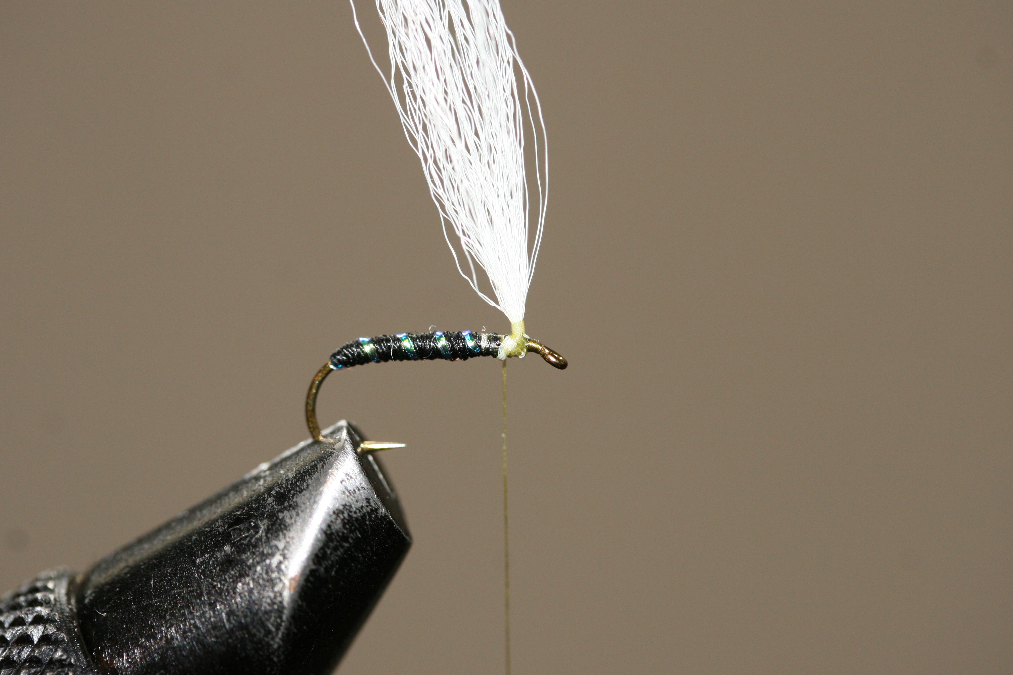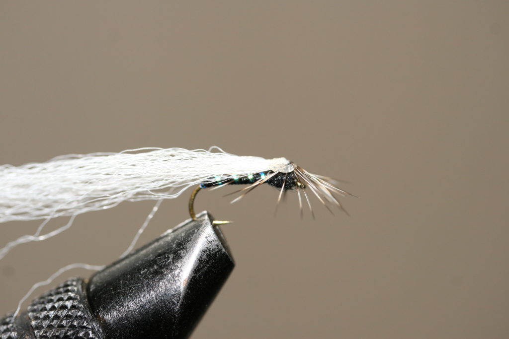 Bakkroppen er sort bindetråd, med et enkelt flashstrå som rib. Vingen er hvit polygarn bundet inn som en fallskjermvinge, mens forkroppen er svart dubbing. Et grizzly-hackle tilpasset krokstørrelsen bundet inn horisontalt rundt vingerota imiterer bein. En liten klatt smeltelim i vingebasen på fallskjermhackelet mens man drar vingen bakover sikrer at vingen holder seg i denne posisjonen.