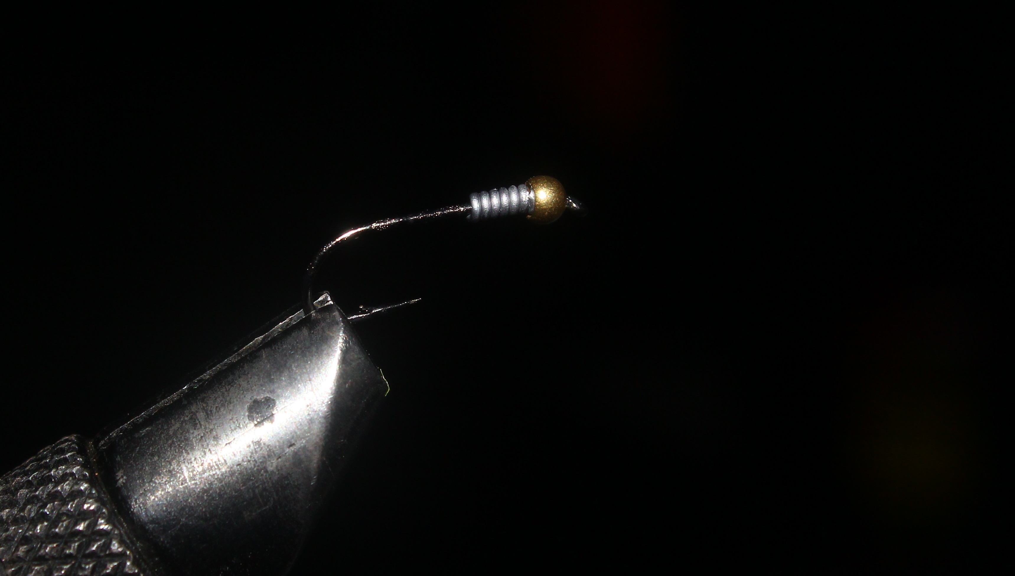 1) Ørretboksen - gul døgnfluenymfe: Jeg liker å lage nymfer på lange kroker, her i selskap med et kulehode og noen surringer blytråd. Foto: Lasse Bøe
