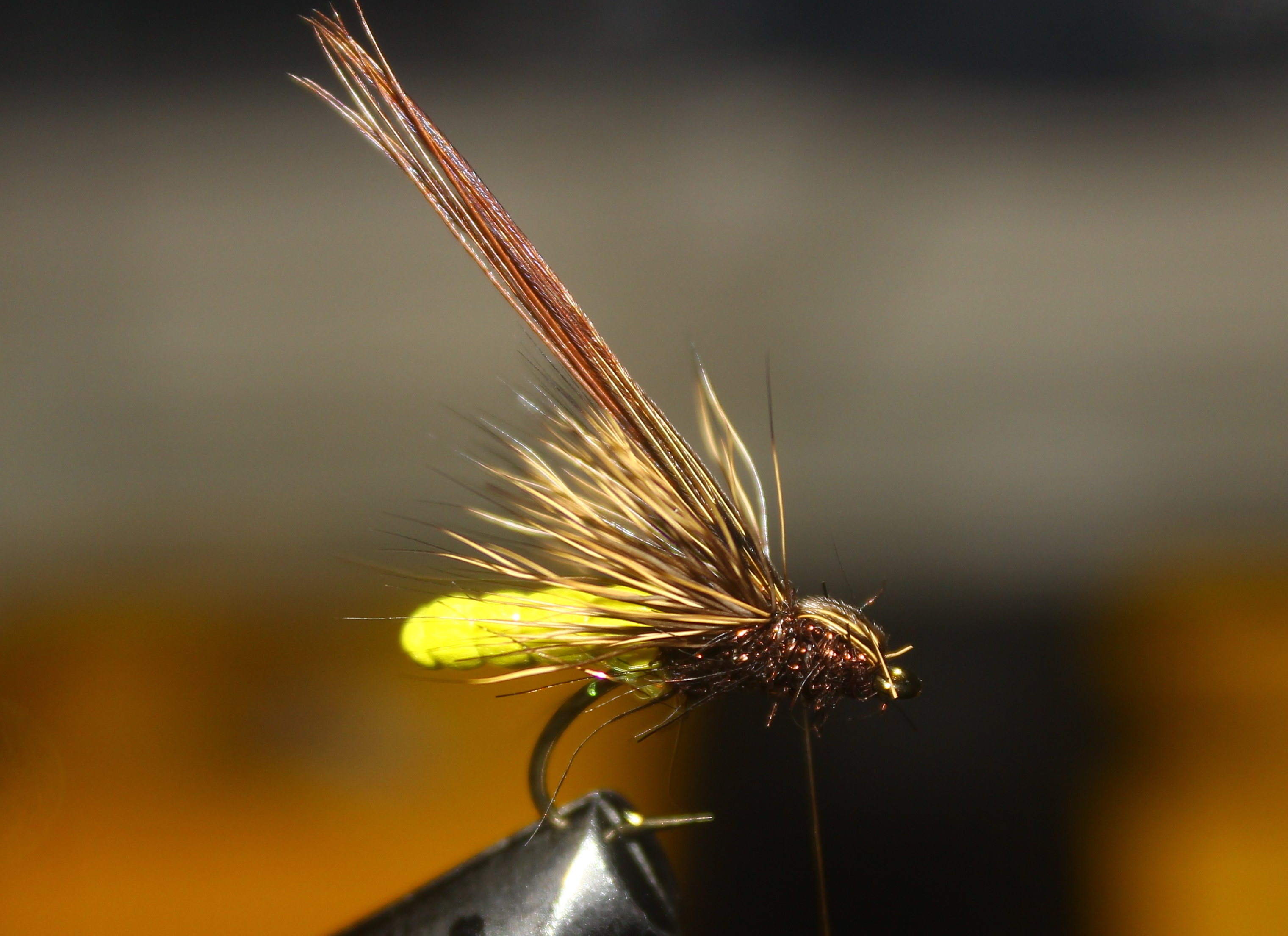 13) Ørretboksen - klekkende vårfluepuppe: Brett fasanhalefibrene bakover, og avslutt med whip finish etter noen harde turn med bindetråden. Foto: Lasse Bøe