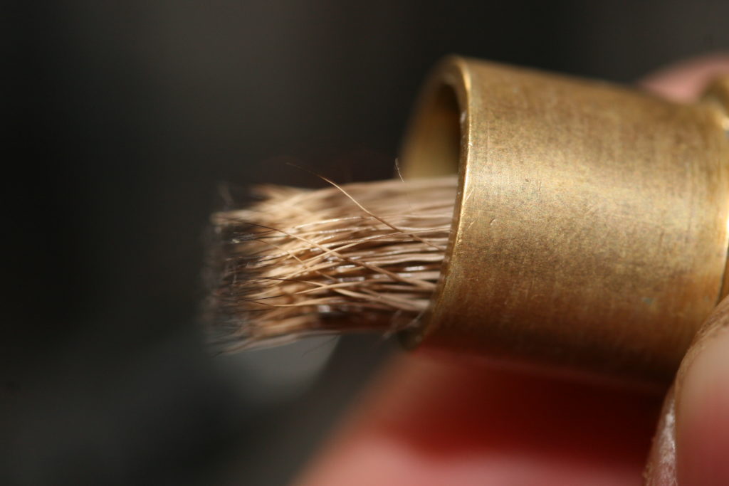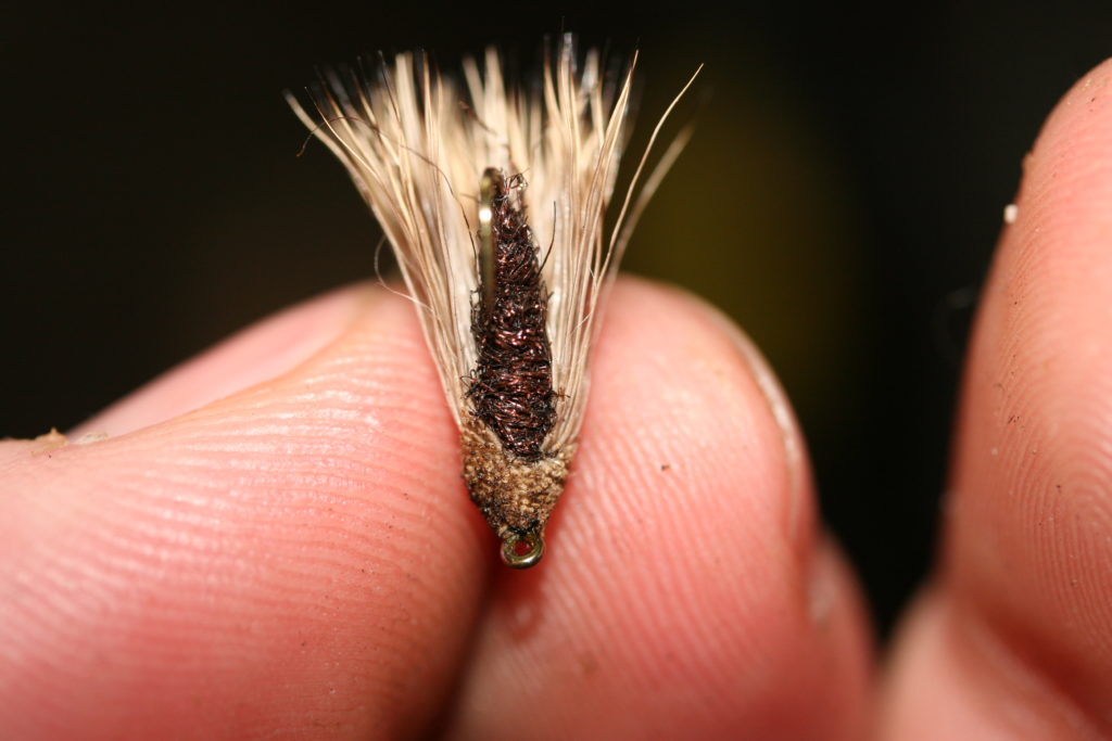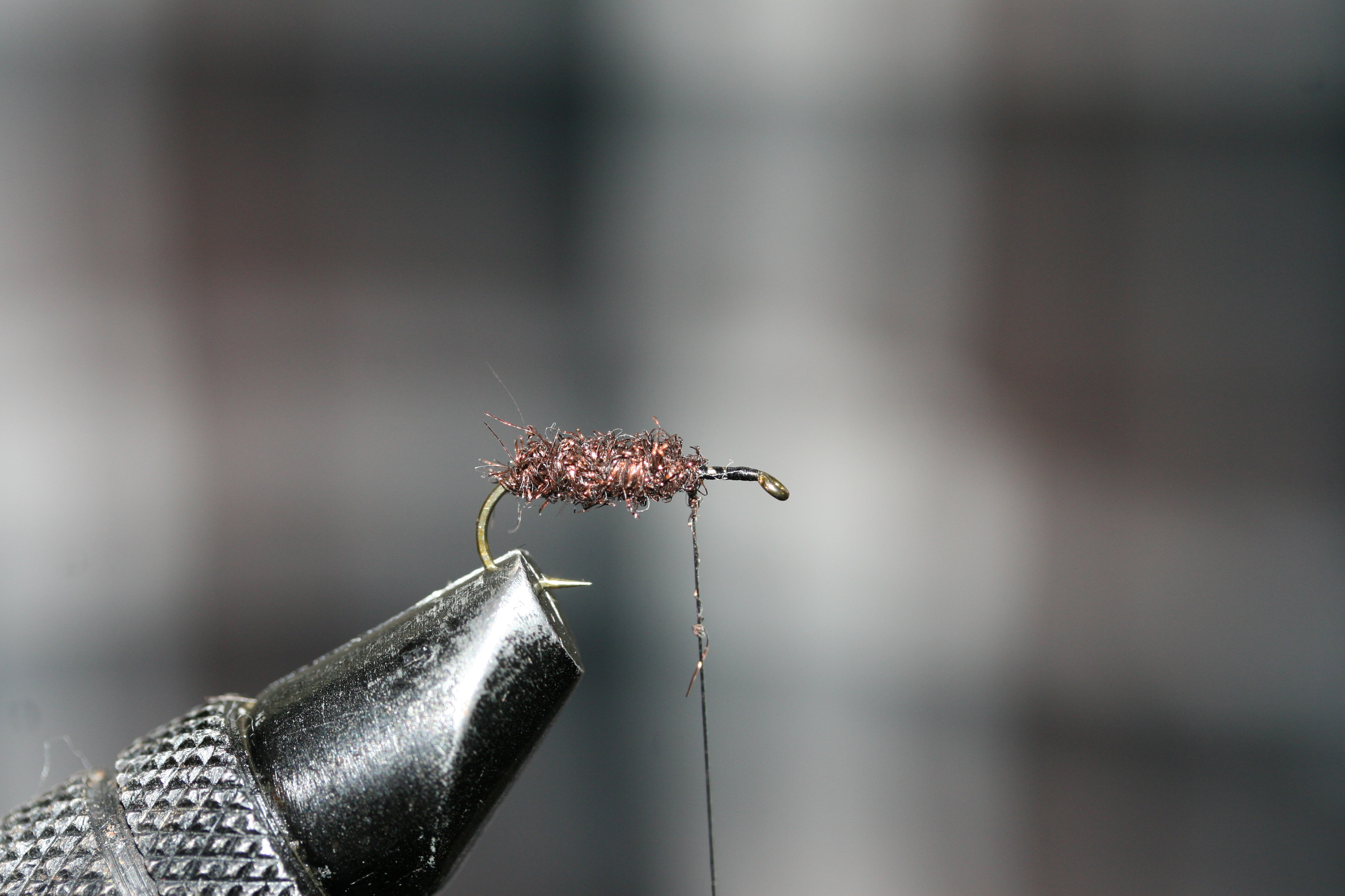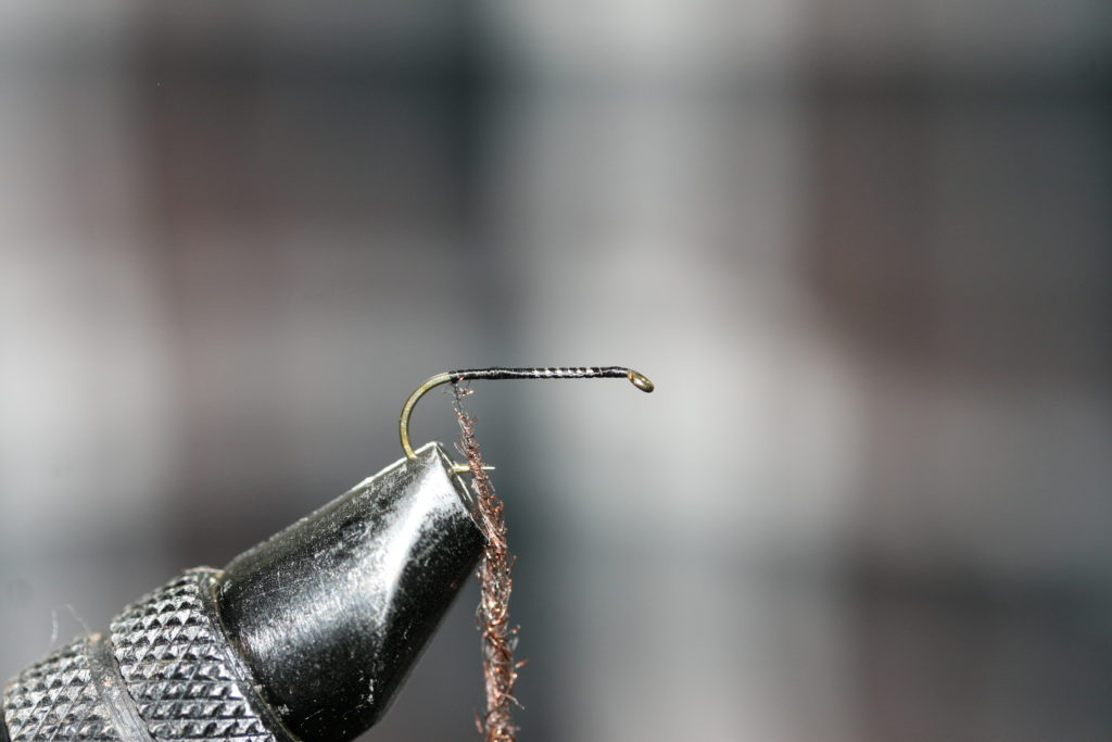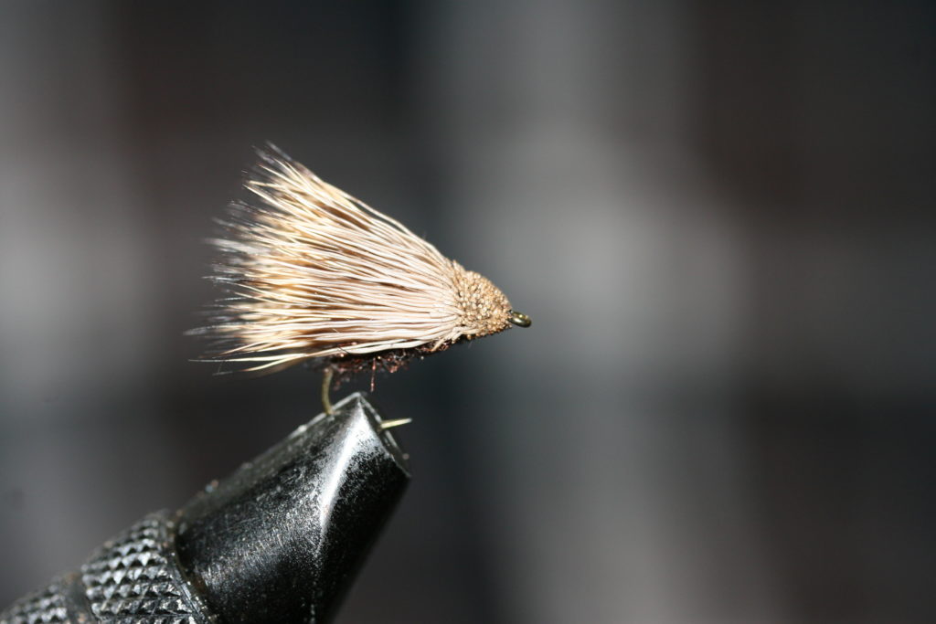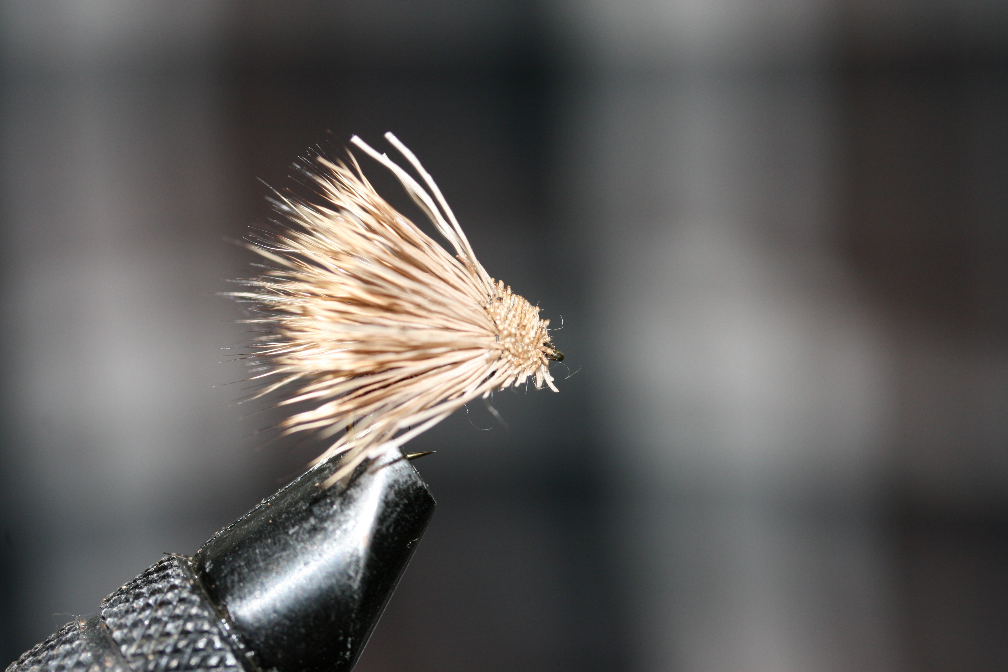 Streaking Caddis 1) Fest bindetråden, og surr deg bakover til krokbøyen.Streaking Caddis 2) Dubb bindetråden med brun dubbing (her er Ice Dub i fargen Dark Chocolate blitt brukt)Streaking Caddis 3) Bygg opp en avlang bakkropp med dubbingen.Streaking Caddis 4) Klipp av en god bunt med hjortehår, fjern korte fibre og underull og putt hårene i en hårstabler.Streaking Caddis 5) Legg den stablede hårbunten på toppen av kroken, og la hårspissene rekke ca 1/2 kroppslengde utenfor krokbøyen.Streaking Caddis 6) Legg to løse tørn med bindetråden rundt krokskaft og hårbunten.Streaking Caddis 7) Stram de to surringene jevnt nedenfra og opp så hårene begynner å spre seg.Streaking Caddis 8) Legg flere tighte tørn med bindetråden fremover i hårbunten, og avslutt rett bak krokøyet. Sjekk at vingen står riktig på toppen av krokskaftet. Whip finish og kutt tråden.Streaking Caddis 8) Begynn å trimme hårene med en skarp saks.Streaking Caddis 9) Når grovklippingen er gjort, bruk en lighter til å rense opp hodet. Et par korte dunk med lighteren er ofte nok. Lighterflammen soter hjortehårene noe, så bruk en tannbørste til å børste soten av. Streaking Caddis 10) Flua sett underfra. En smule skeivhet på «haka» på flua, men det bryr ikke fisken seg om. Streaking Caddis 11) UNI 6/0 er en god bindetråd som er sterk og tykk nok til å ikke kutte hjortehårene.