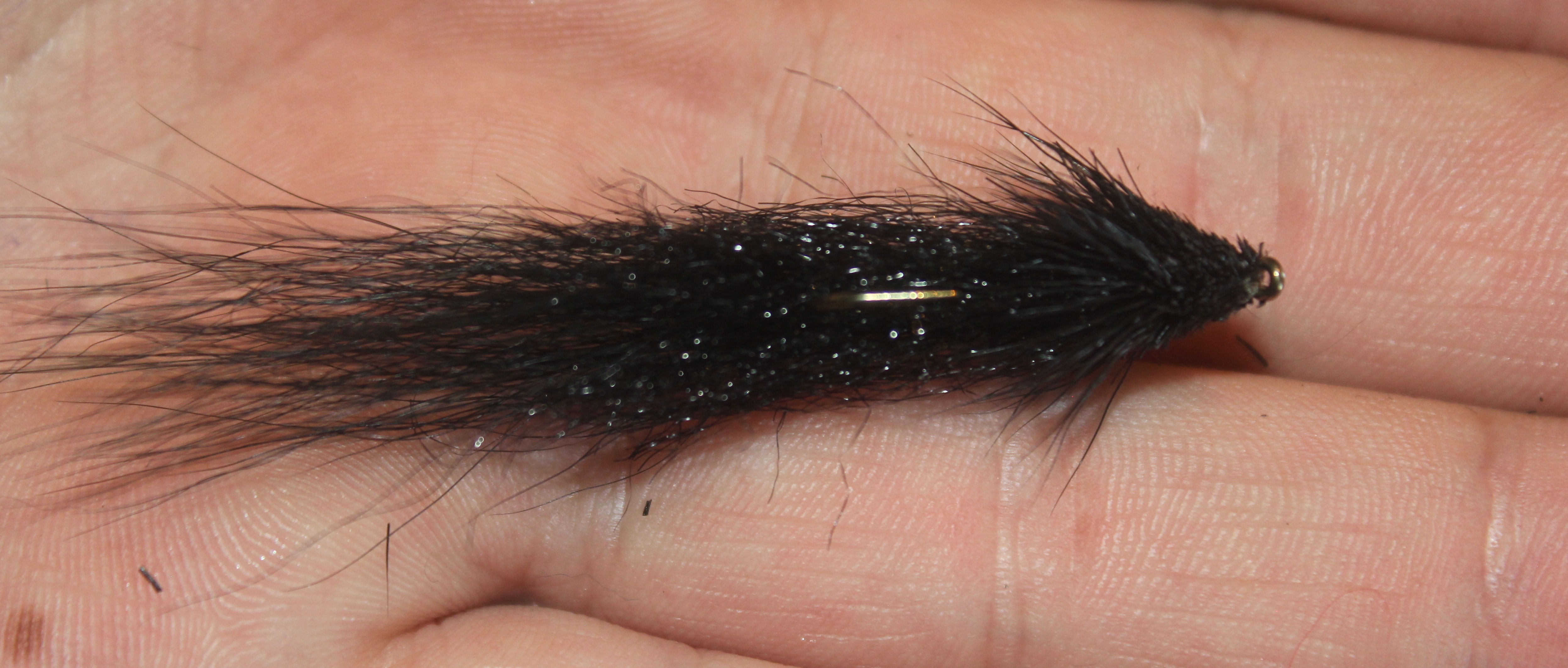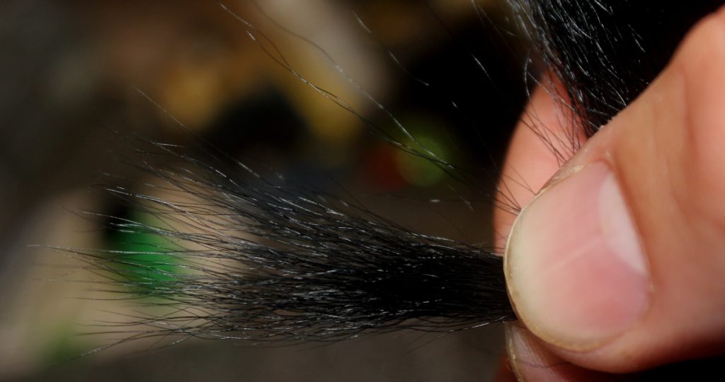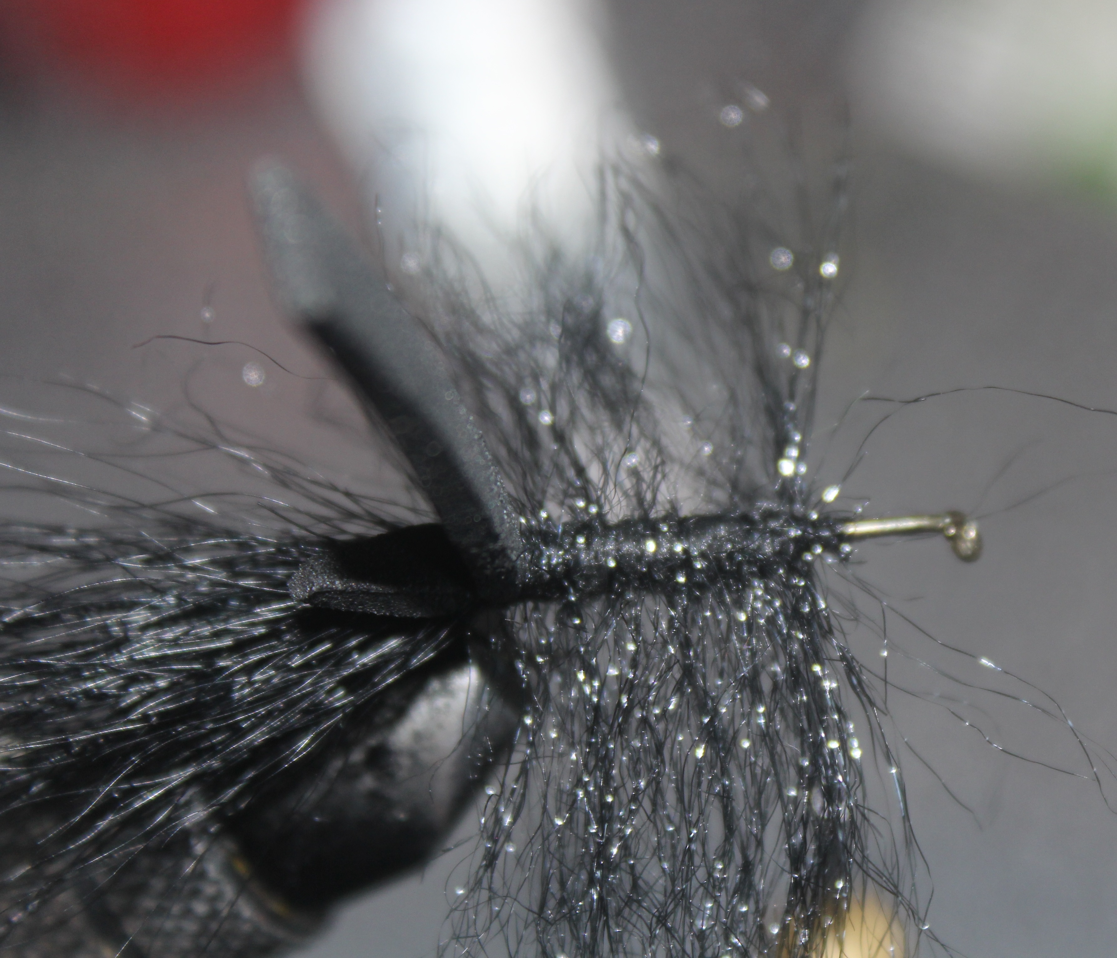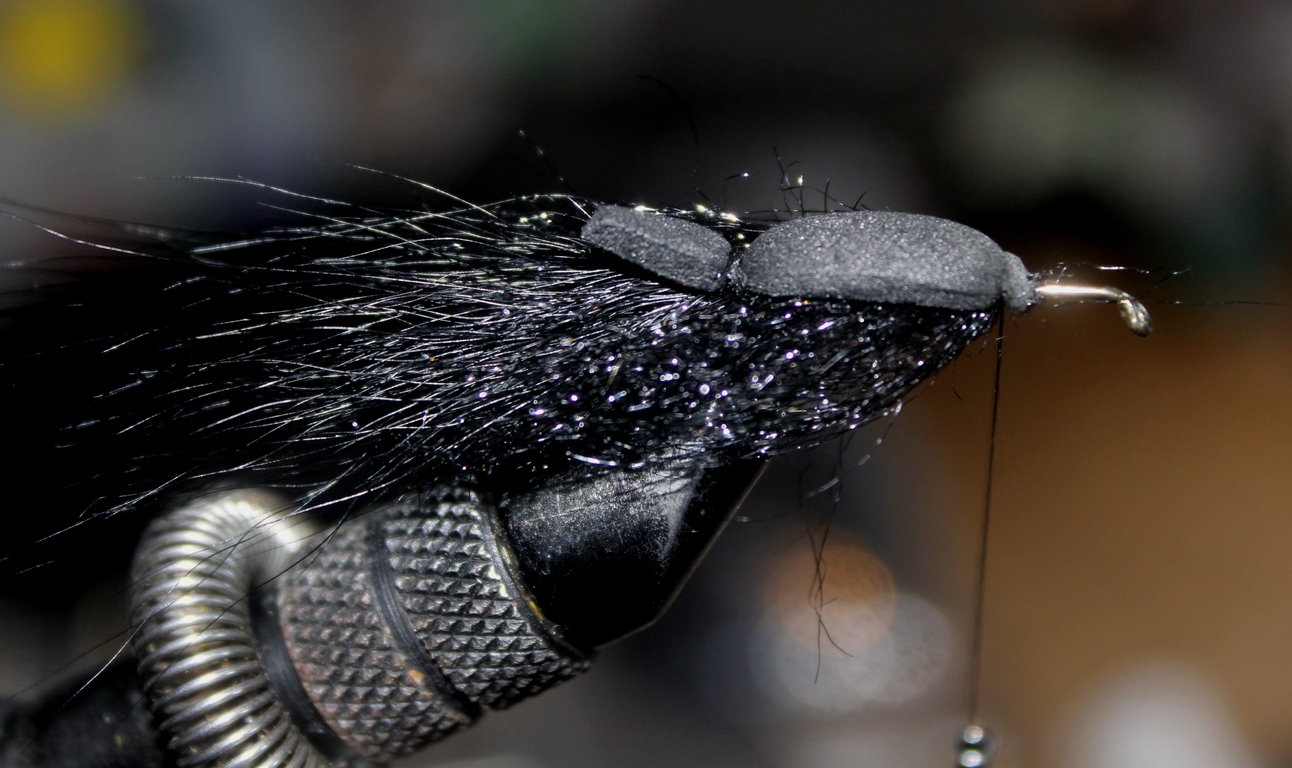 Som de aller fleste av fluene jeg lager, er Svartedævven bestående av få materialer. Svart er fargen som gir best silhuett mot nattehimmelen, og derfor er alle mine nattefluer svarte. Svart bucktail utgjør halen, svart ryggskjold av foam, og muddlerhodet av også av svart hjortehår.