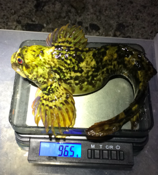 Jeg var ute og vadet etter flatfisk på stranden. Full flo gjorde at jeg måtte gå helt inn i fjæren og steinene for å ikke havne på ein ufrivillig svømmetur. Regnet kom og ting virket ikke lovende. Regnet gjør at vi ikke ser klart i vannet. Vi fant ut det var best å komme seg på land og tilbake til bilen. Vi brukte teknikken kikkfiske med tungevindu, men nå ble det i dette tilfellet kun brukt til å se hvor jeg gikk. Jeg ville ikke snuble over steiner eller andre hindre i sjøen. Mens jeg gikk mot land kom jeg over en svær tangkvabbe. , Denne ville jeg jo fiske på, derfor senket jeg ned en krok egnet med kokt reke. Den var ikke vanskelig å be, og opp kom den. Jeg visste at denne var stor da jeg har fisket en del av dem før, men var ikke sikker på hva norgesrekorden var. Jeg veide den og fant ut at norgesrekorden var 87 gram. Gleden ble stor da to forskjellige vekter viste 96,5 gram. Fisken var 20cm på målebåndet og 3,5 cm lenger enn tidligere norgesrekord, forteller Sebastian.