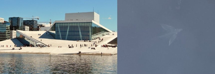 Operahuset i Bjørvika, tatt av Lars Mæhlum. – Flyvefisken er en skjermdump av videoen til Charlotte Olofsson