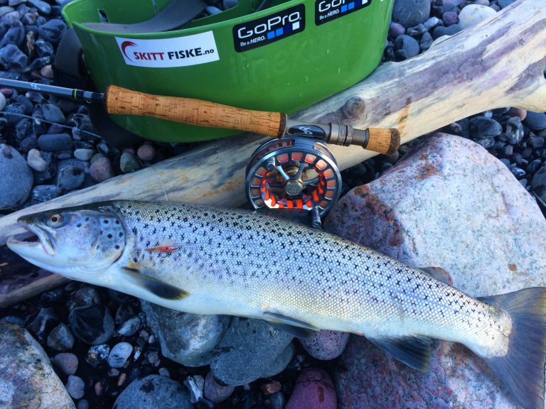 Jeg hadde rigget litt lenger fortom denne dagen og på med en size 6 vaskebjørn ettersom det var helt flatt vann. Vi rakk å fiske over plassen vi ønsket mens det ennå var ganske mørkt, men lyset kom fort. Ingenting å merke før jeg så et vak ca 40 meter ut fra land. Her ble det ganske dypt nærme land utover, men det lå noen store steiner på rekke utover som gjorde at jeg fikk karret meg utover. Kom ut til siste steinen og så et nytt vak. La flua midt i vaket, 2 trekk, daletid og pang.. Fin sjøørret som tok flua og gikk rett i lufta før den satte fart rett mot meg. Den forsvant ganske så fort dessverre. Etter denne tok jeg vel 10 kast der jeg fikk 3 og mistet 5, men disse var mindre fisker.