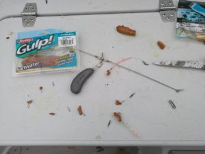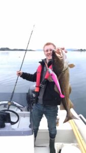 Karl Johan Nilsson brukte Gulp agn når han fisket fra båt.Testet litt og fikk hyse på den nederste på første nedslipp, men agnet gikk av kroken med en gang.