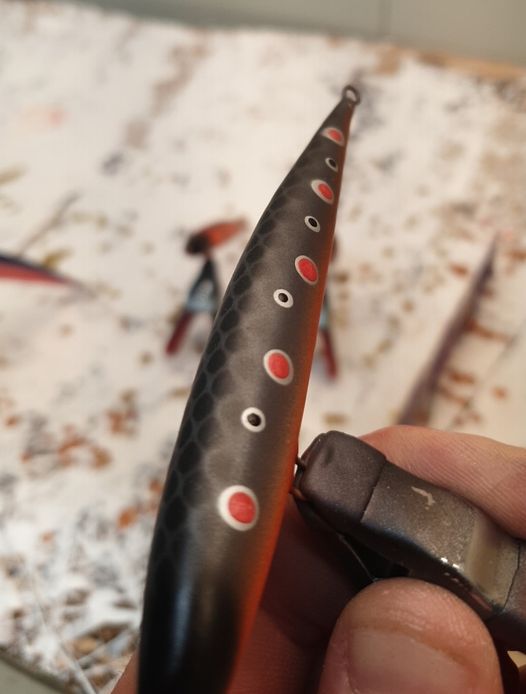 -Jeg bruker airbrush og vannbasert lakk. Når den er lakkert, toppcoater jeg wobbleren 3-4 ganger med klarlakk, før jeg sager inn spor og limer på leppa. Etter at den er sentrert og limt, coater jeg wobbleren enda 3 ganger etterpå.